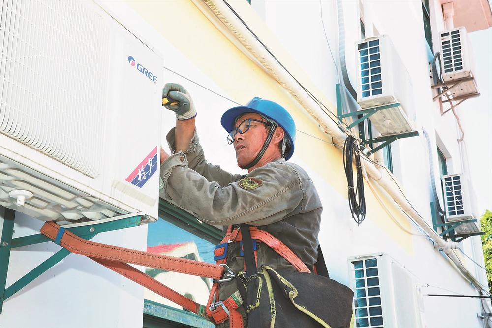 7月12日,在铜陵市义安区东联镇养老服务中心,师傅冒着高温安装空调。义安区民政局联合东联镇政府开展为群众办实事、办好事活动,在养老服务中心老人宿舍、食堂及活动区域安装了70多台空调,让老人们安心度夏。 本网通讯员 潘伟 姚长生 摄