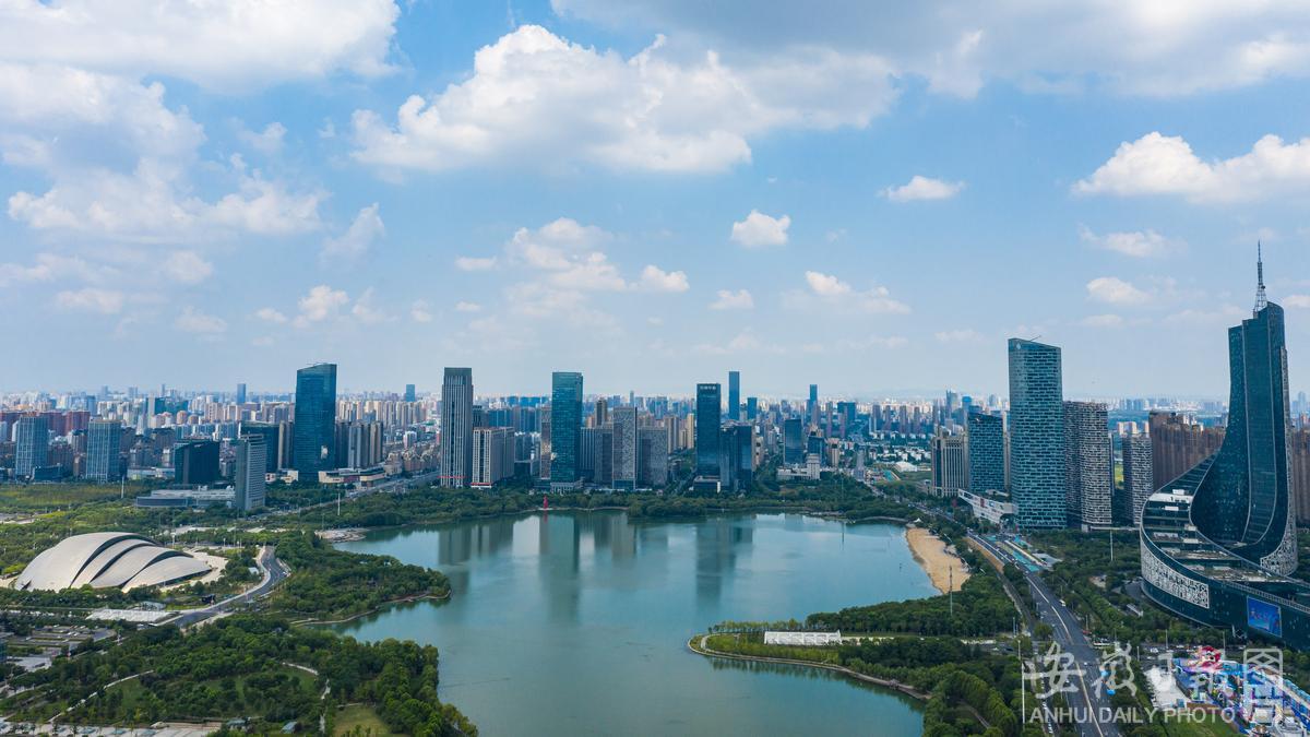 8月8日航拍的合肥市天鹅湖畔碧空如洗,天高云淡。今年以来,合肥生态环境质量持续改善,上半年,该市空气质量优良率83.6%,同比提高0.5个百分点。