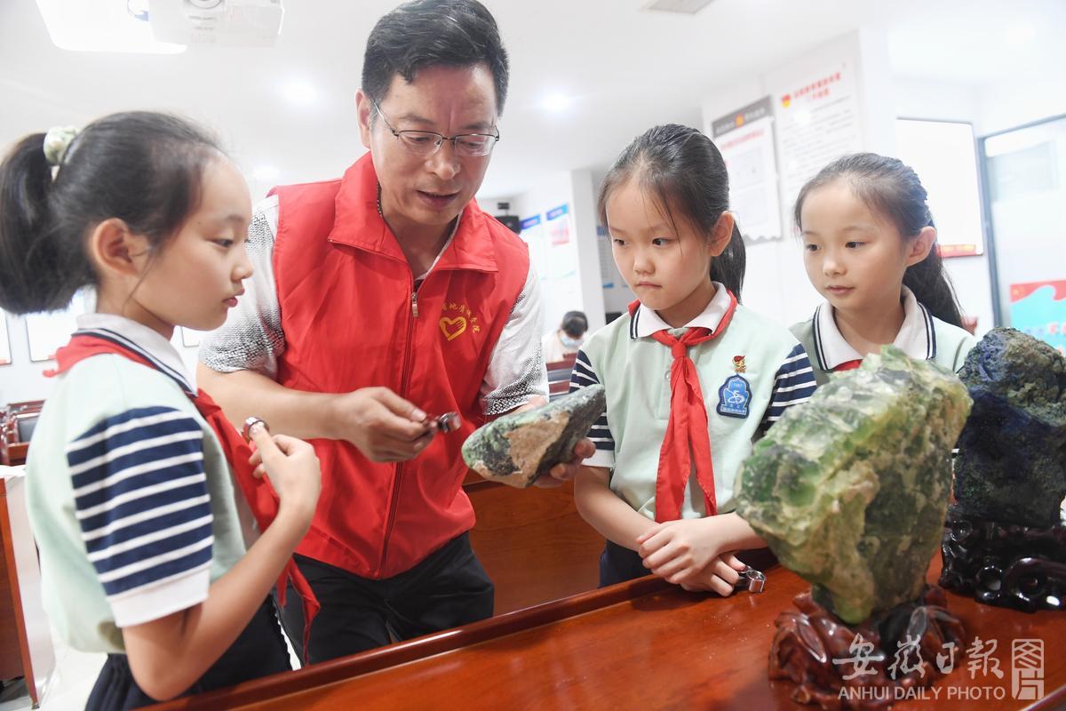 8月4日,合肥市西园新村小学南校的学生,在浅水湾社区科普志愿者引导下,做科学实验、学地质知识,提升科学素养。今年暑期,合肥市在全市范围内推广社区与志愿者课堂联动,让孩子们在家门口就可以免费参与科普、文体、艺术等丰富多彩的兴趣课堂活动。 本网记者 杨竹 摄