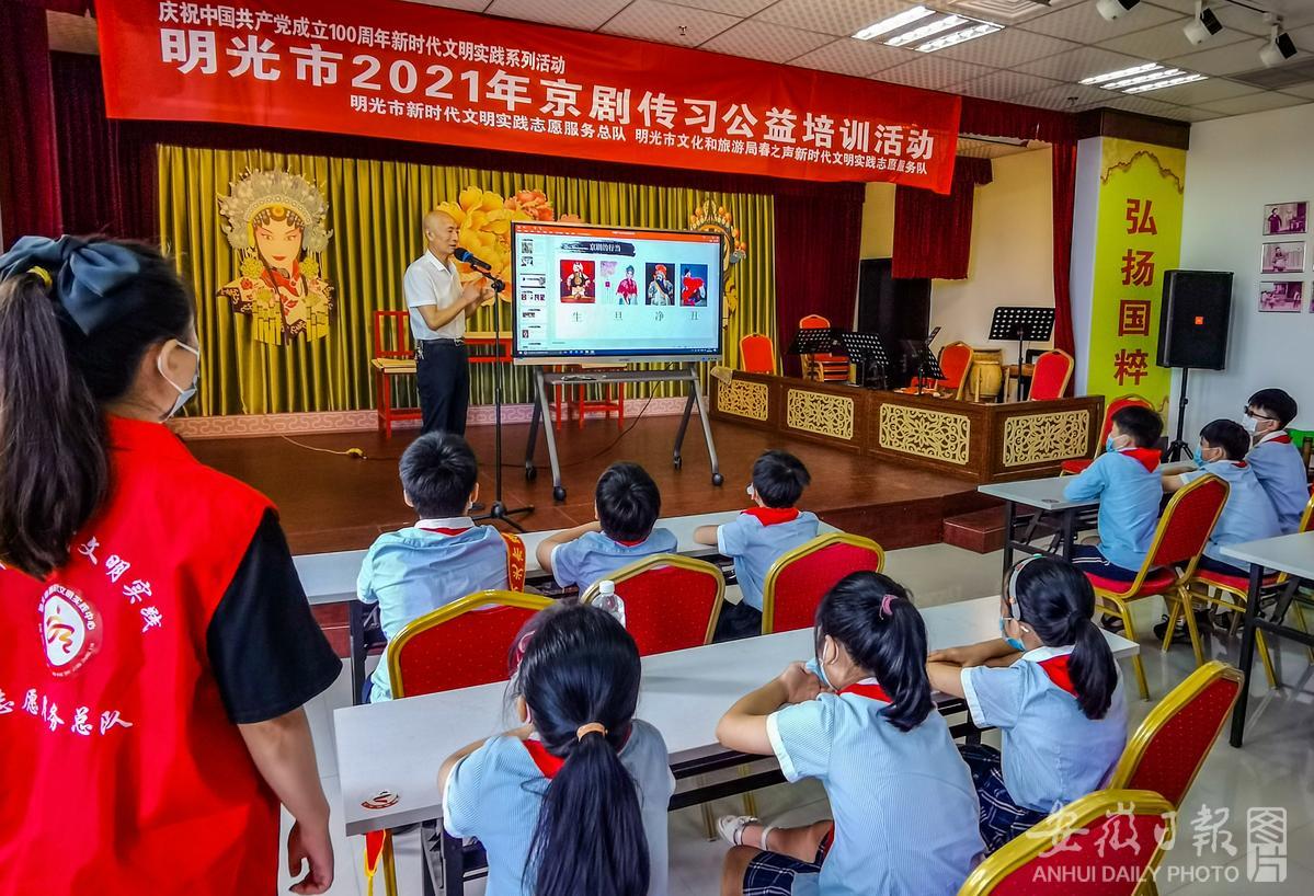 8月3日,在明光市文化馆里,学生在参加暑期少儿京剧免费培训。今年暑期,明光市文化馆通过“线上线下齐步走”模式,开展非遗剪纸、少儿京剧、舞蹈、美术书法教学等系列活动。 本网通讯员 王绪波 尹思源 摄