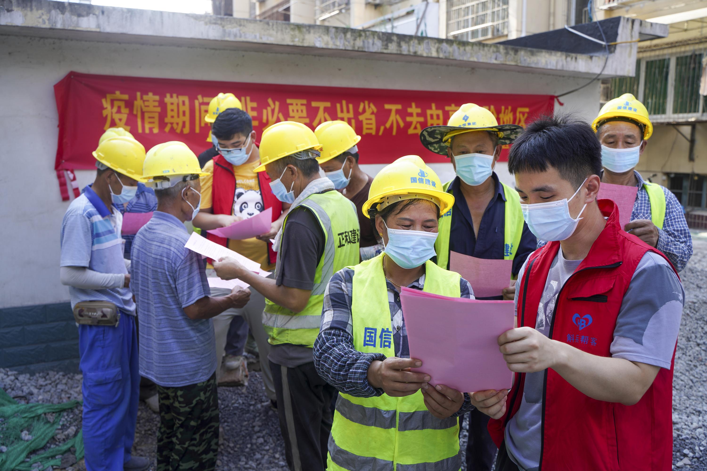 8月6日,合肥市包河区包公街道雨花桥社区防疫志愿者,向辖区建筑工地工人宣传防疫知识。近日,包河区开展“防疫宣传进工地、进社区”活动,为群众安全筑牢防疫屏障。 (本网记者 李博 本网通讯员 马莉 摄)