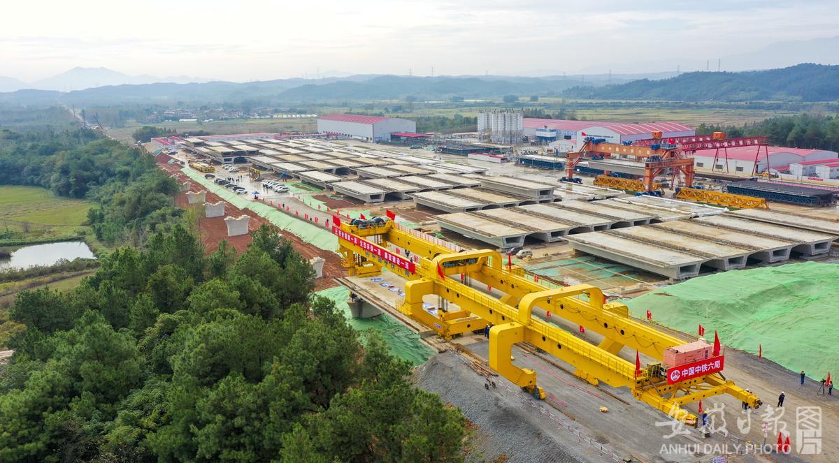 10月18日,国家重点工程宣绩高铁首片箱梁在宣城市宣州区黄渡乡邵村境内由中铁六局成功架设,标志该高铁从“线下”转入“线上”施工阶段。通讯员 聂海岩 叶四清 摄