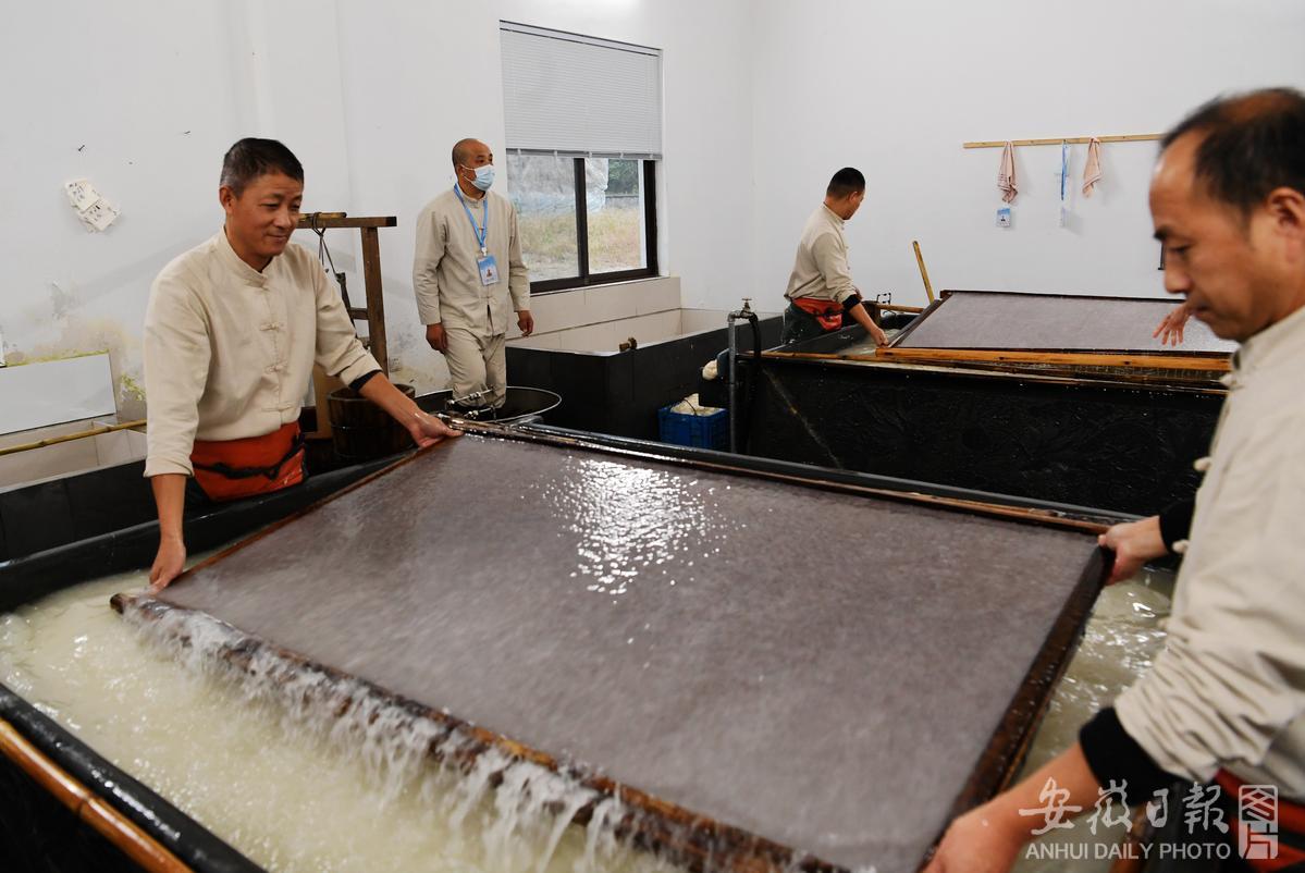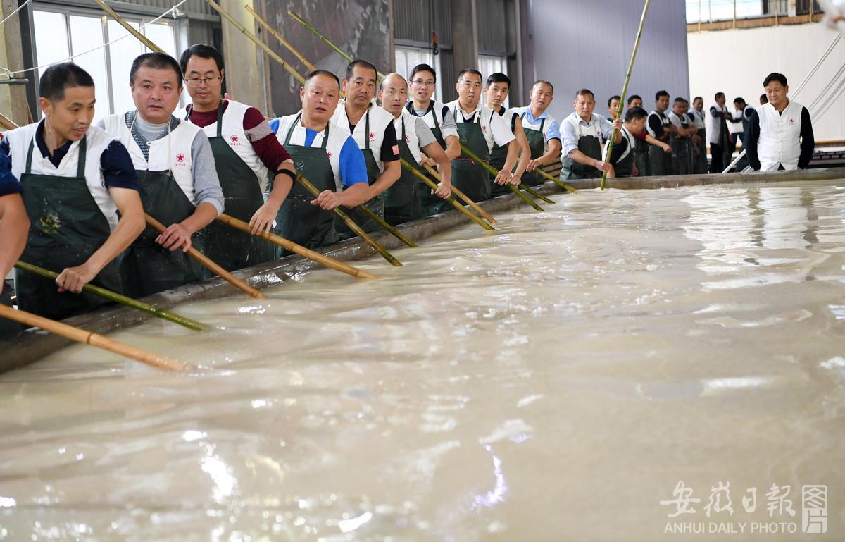 50多名宣纸师傅在捞制“三丈三”巨型宣纸。