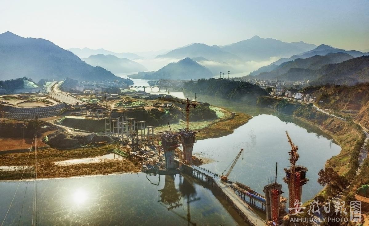 12月5日拍摄的黄千高速歙县深渡昌源大桥及综合服务功能区施工现场。黄千高速连接黄山与千岛湖两大黄金旅游景区,是目前我省高速公路桥隧比最高的高速公路,工程计划2022年建成通车。 通讯员 郑宏 摄
