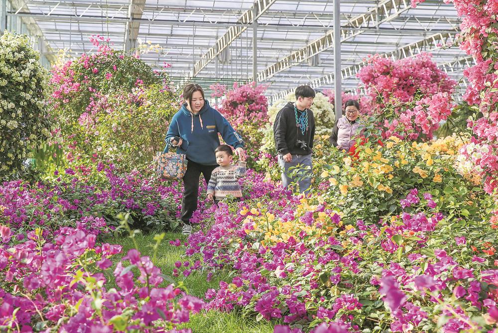 3月2日,歙县郑村镇四月乡村农业科技园温室内,花色各异的三角梅花让游客流连忘返。近年来,该县加强生态文明建设,大力推动绿色发展,引导当地农业经营主体打造航天育种示范基地、无土栽培等科技农业园区。