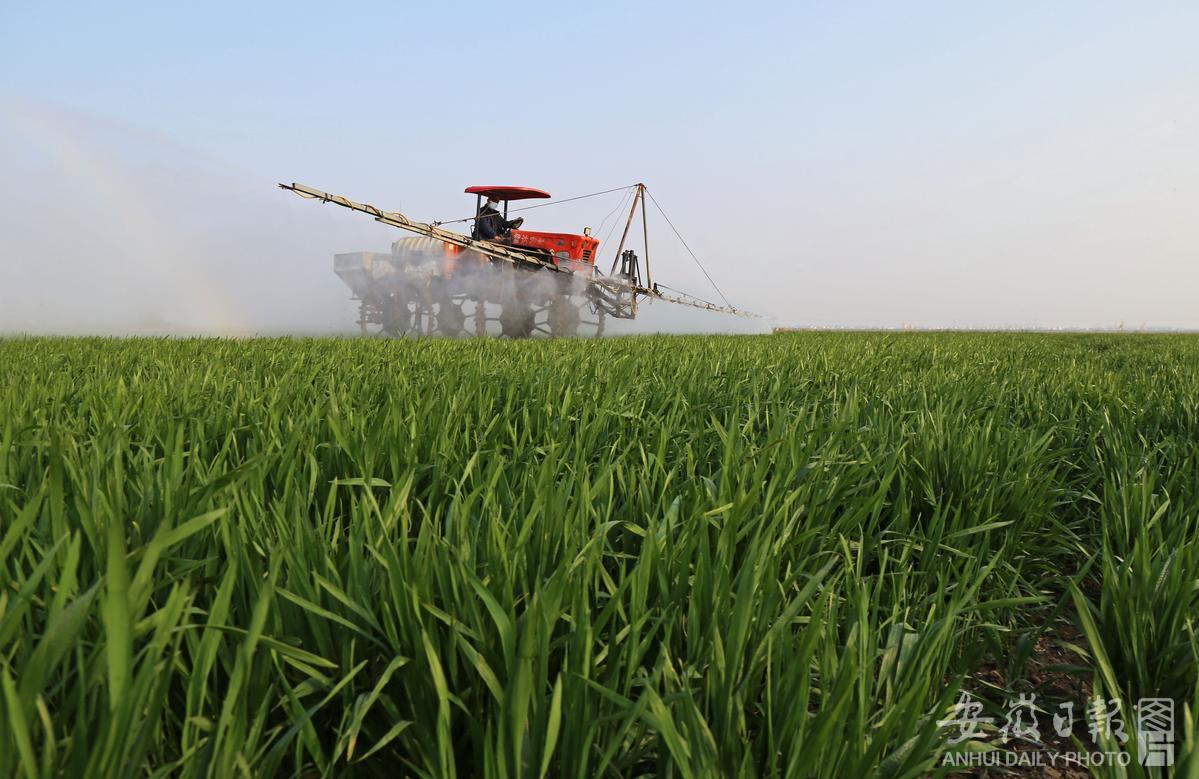 3月3日,安徽农垦华阳河农场使用宽幅高架喷杆打药机进行小麦纹枯病防控作业。 通讯员 李龙 摄