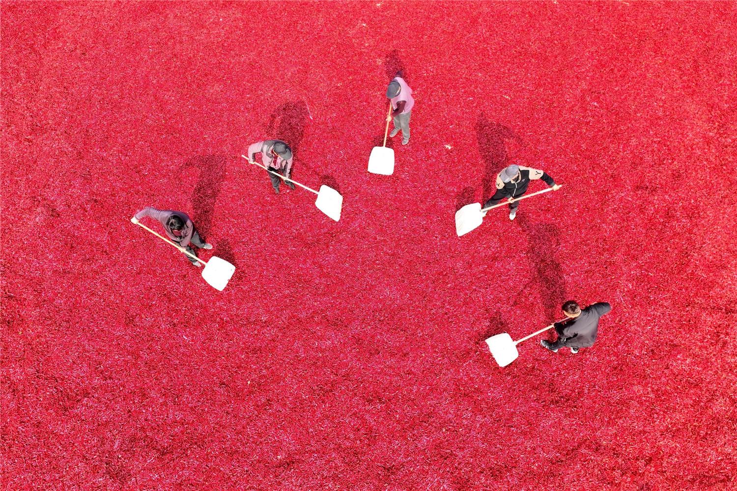 11月20日,亳州市谯城区大杨镇郭万村杨敏亮小辣椒专业种植合作社,农事钟点工在晾晒小辣椒。近年来,该镇立足资源禀赋,优化产业结构,按照“党支部+合作社+农户”的模式大力发展小辣椒产业,推广种植新技术,推动小辣椒种植规模化、生产标准化、服务便捷化、加工链条化、营销品牌化,通过订单农业带动群众增收致富,把小辣椒做成了乡村振兴“大产业”。