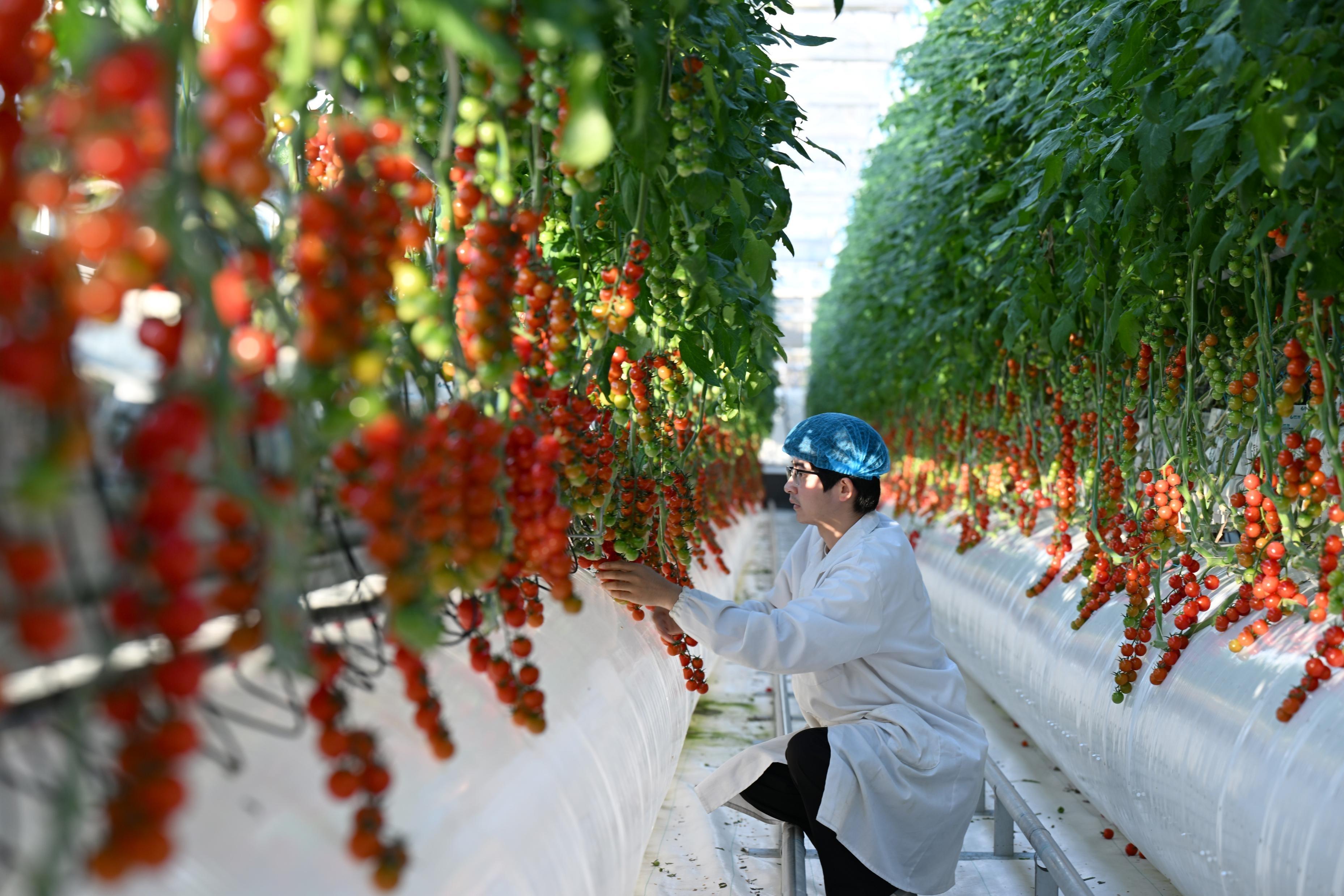 近日,在位于合肥市包河区大圩镇的数字化工厂,农技人员正在查看番茄长势。目前,该数字化工厂第一穗果以订单形式已销售一空,供应合肥及周边城市中高端市场。本报记者 张大岗 摄