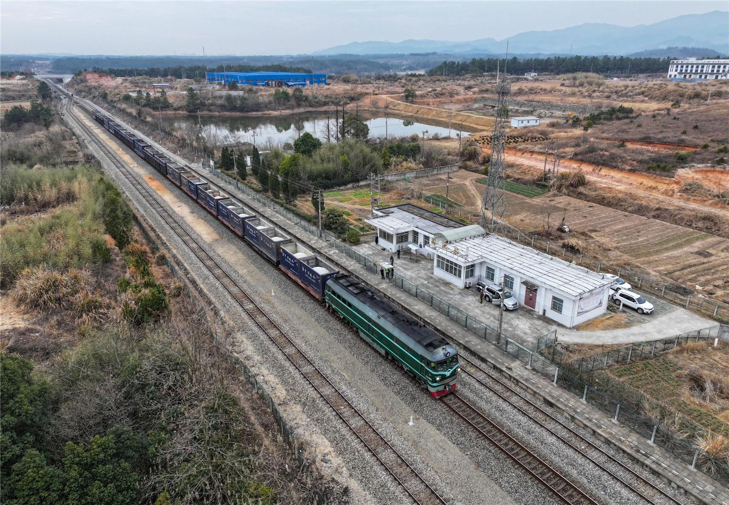 1月14日,春运第一天,货物列车驶过安庆市太湖县小池站。
