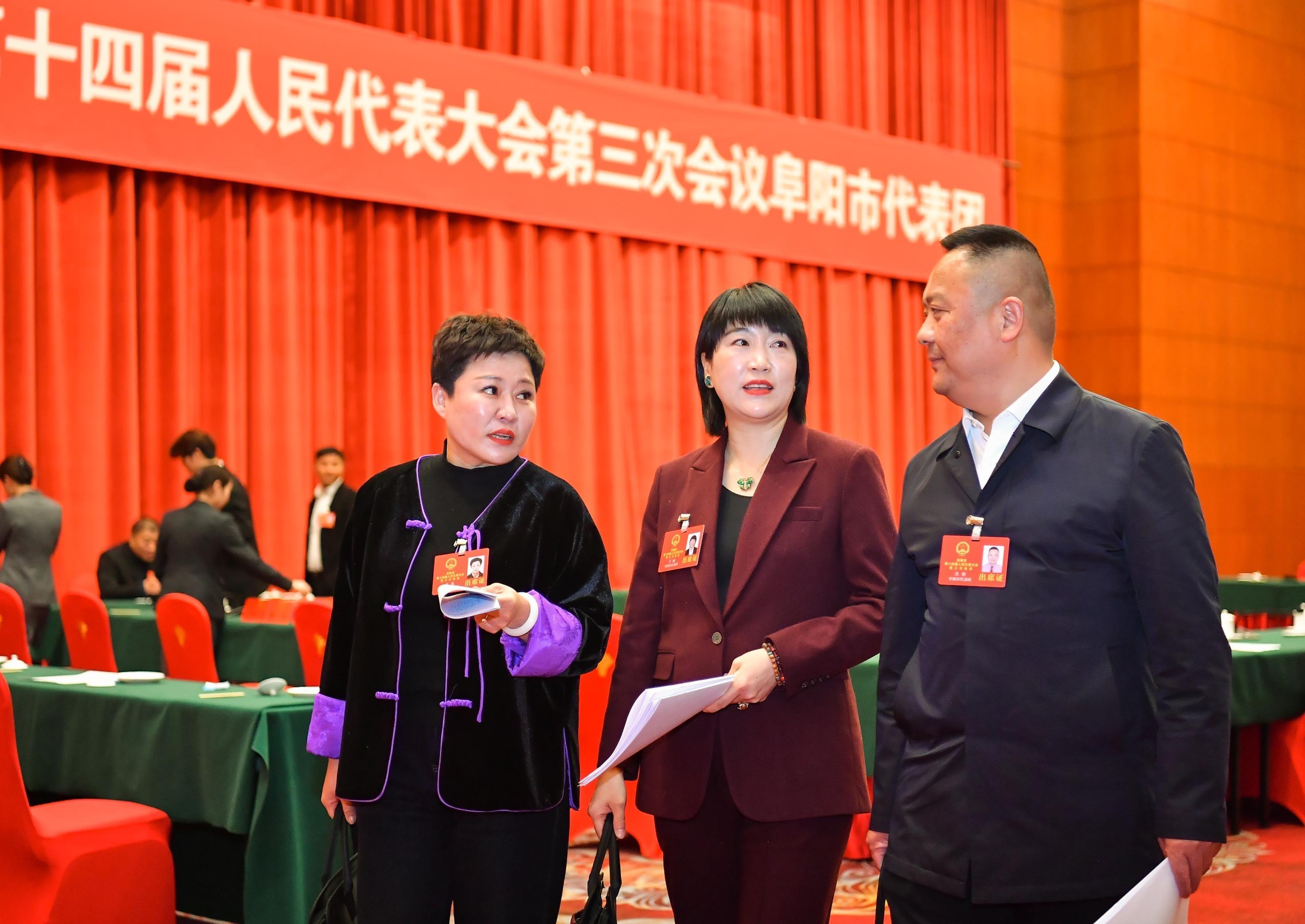 1月20日,阜阳市代表团会议结束后,代表在一起交流讨论。