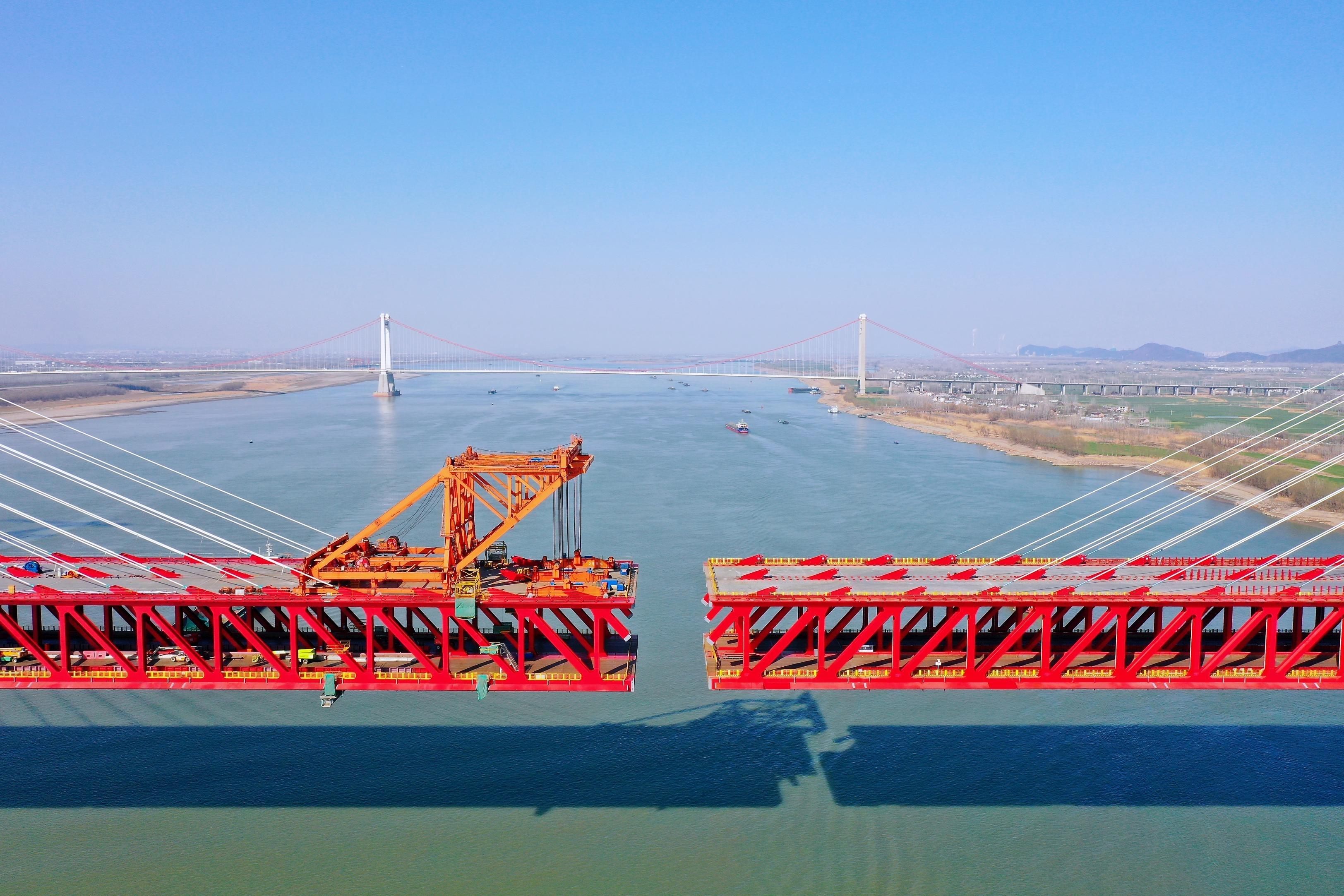 2月9日,马鞍山市当涂县,巢马城际铁路马鞍山公铁两用长江大桥建设现场,建设者们加紧施工,为早日合龙全力冲刺。该桥是集高速城际铁路和城市快速路于一体的公铁两用过江通道,巢马城际铁路建成后将成为安徽通往沪宁杭新通道的重要组成部分。