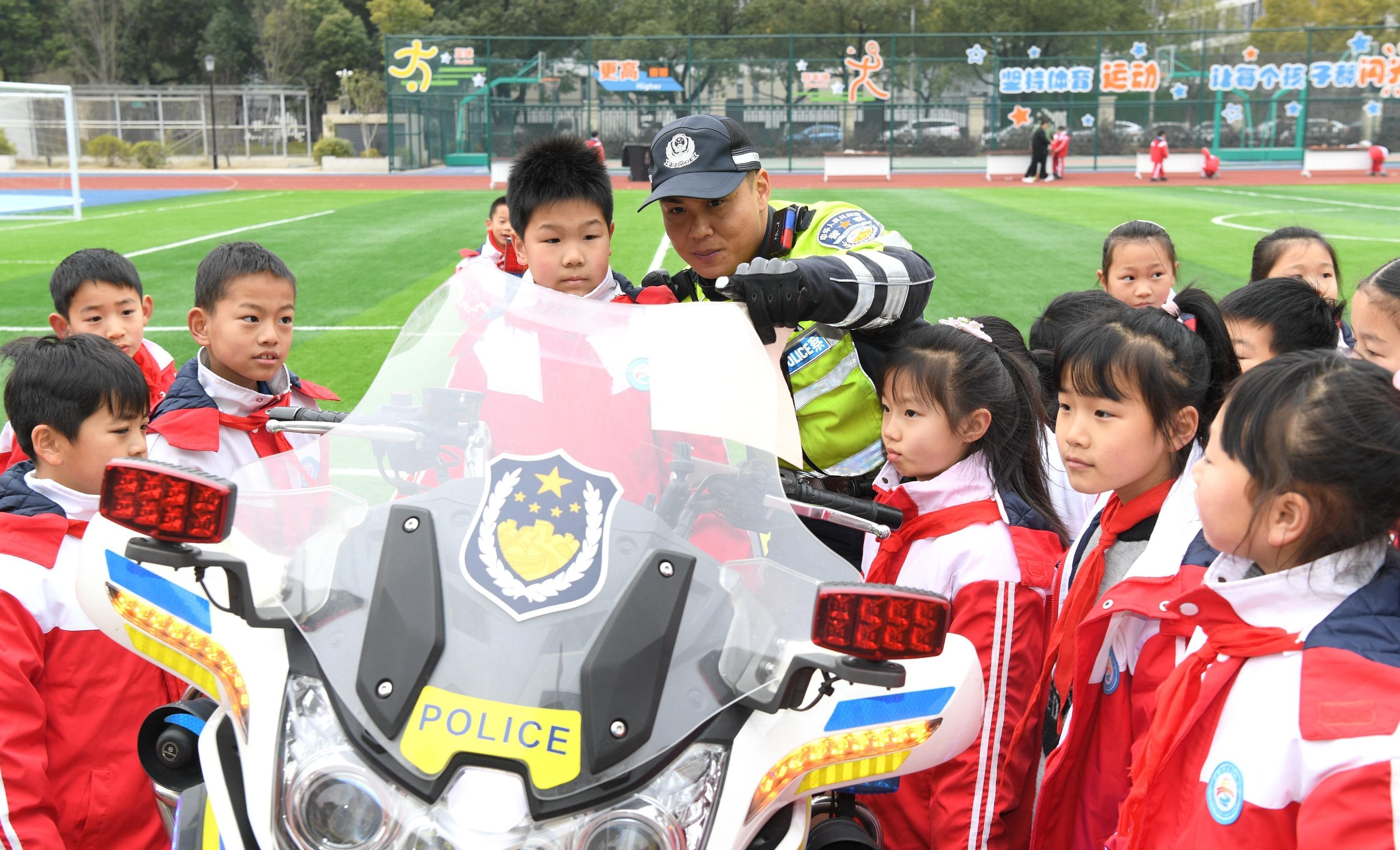 2月14日,在合肥市蜀鑫路小学,合肥市公安局交通警察支队蜀山大队走进校园为学生讲解交通安全知识,上好安全“第一课”。本报通讯员 陈三虎 摄