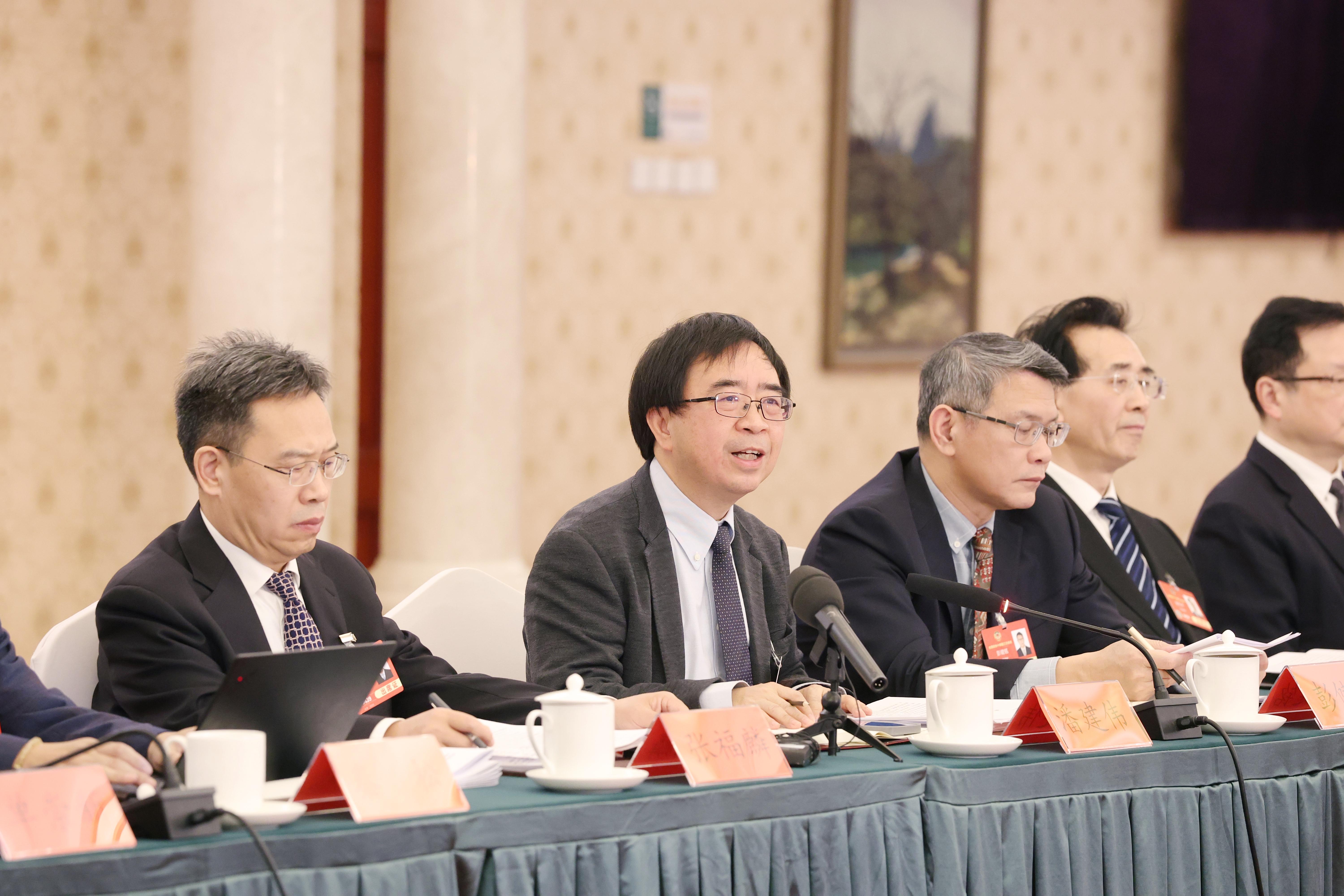 3月6日,住皖全国政协委员潘建伟(左二)在小组讨论时发言。