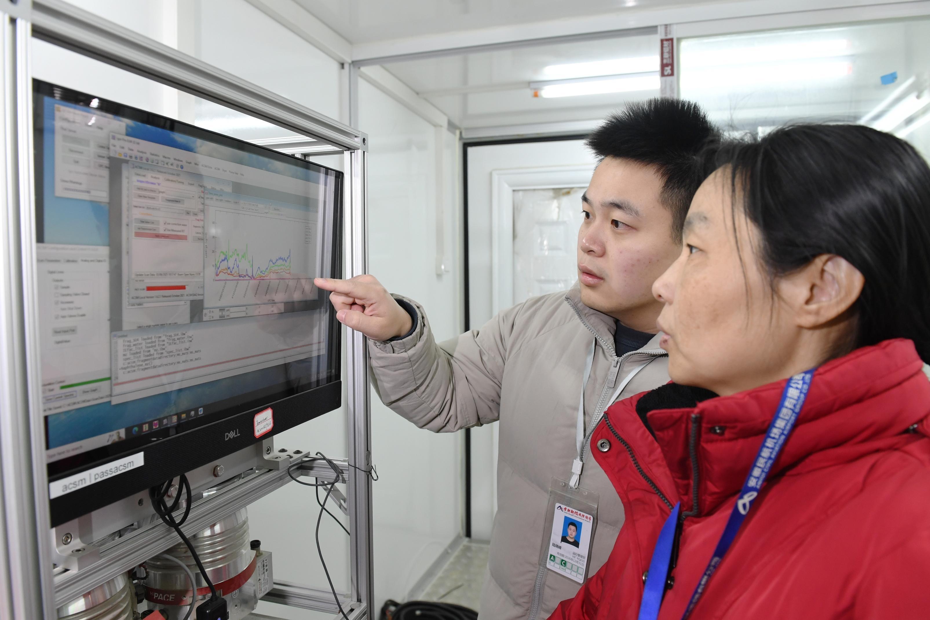 3月6日,在合肥新桥机场,科研人员查看气溶胶质谱仪数据。