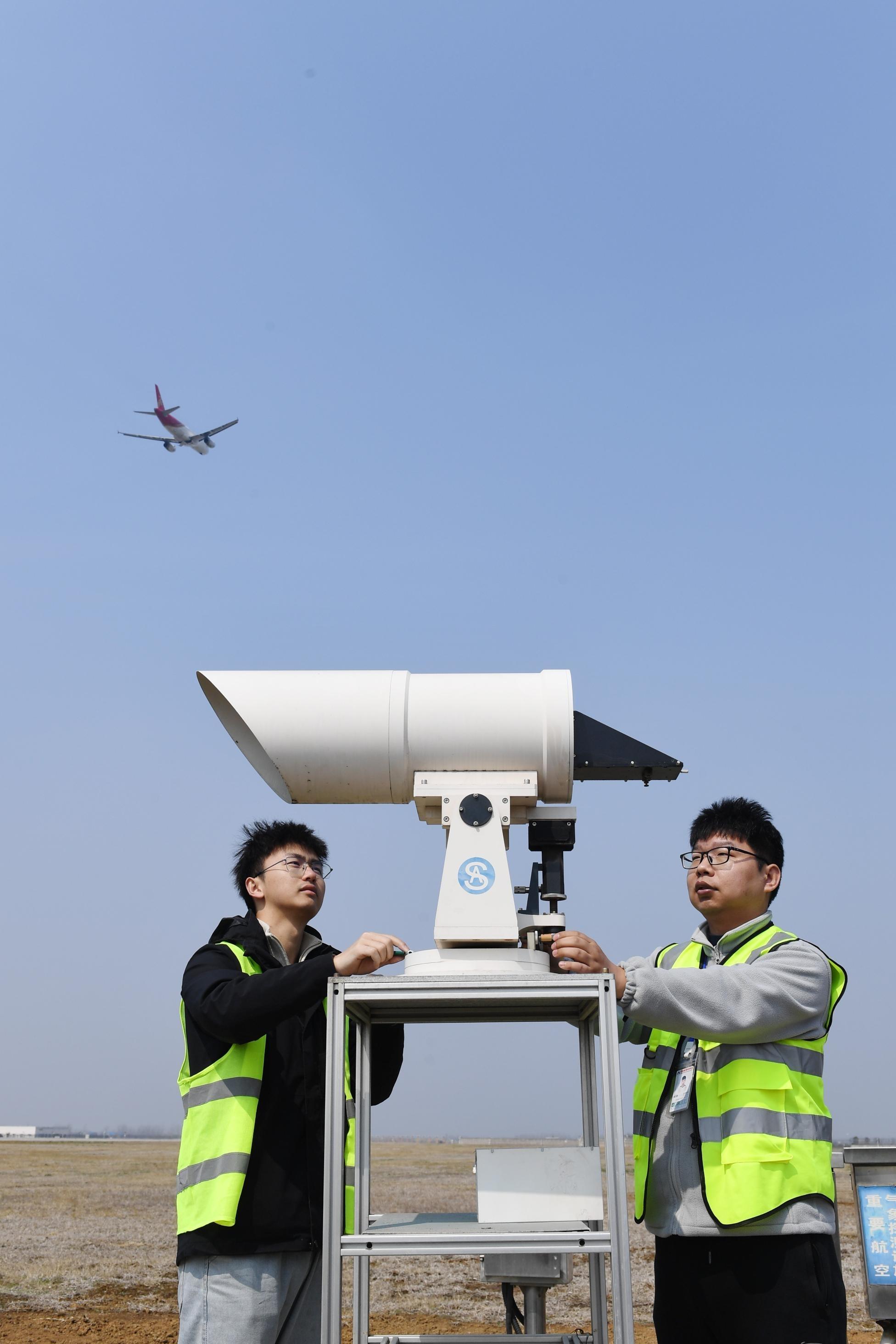 3月6日,在合肥新桥机场,科研人员调试开放光路傅里叶变换红外监测设备。