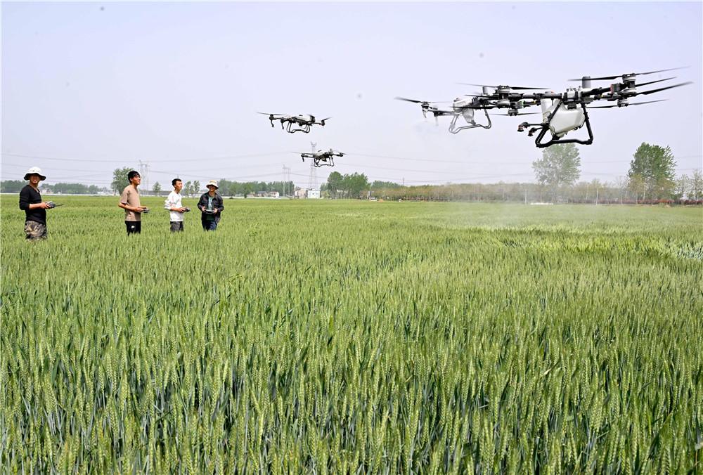 4月17日,在亳州市利辛县胡集镇陈营社区麦田,一家种植专业合作社的社员在操作植保无人机对小麦进行“一喷三防”作业,确保夏粮丰收。 本报通讯员 刘勤利 刘钊 摄