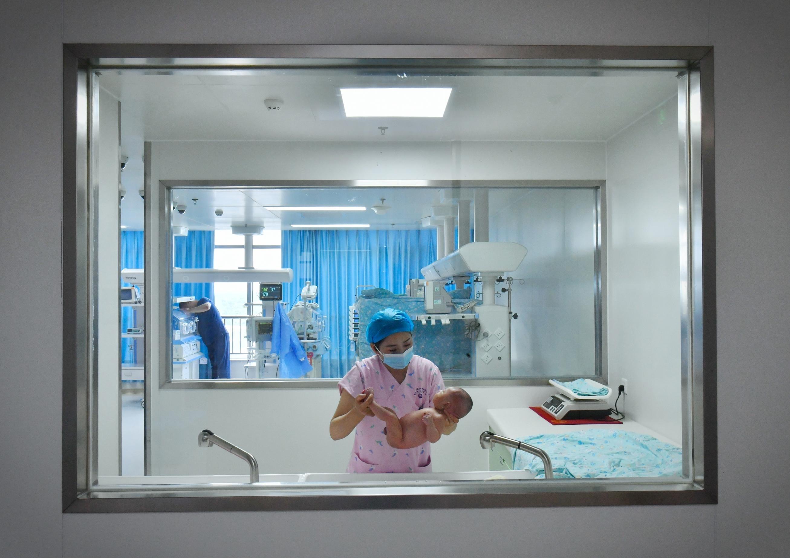 5月9日,安徽省儿童医院新生儿重症监护室内,护士张存为新生儿洗澡。
