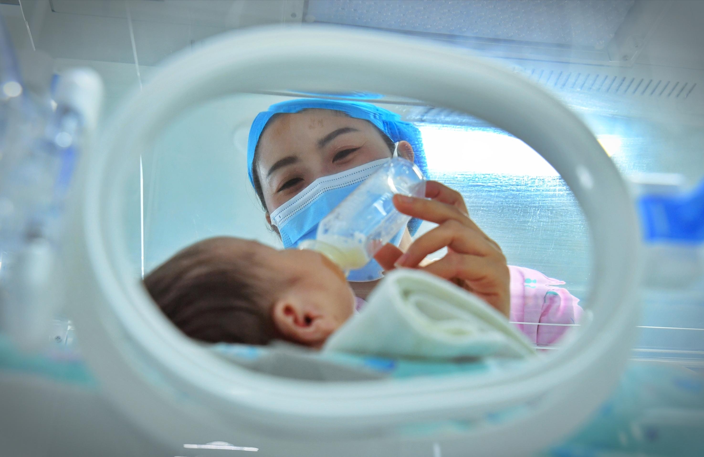 5月9日,安徽省儿童医院新生儿重症监护室内,护士张存给小宝宝喂奶。