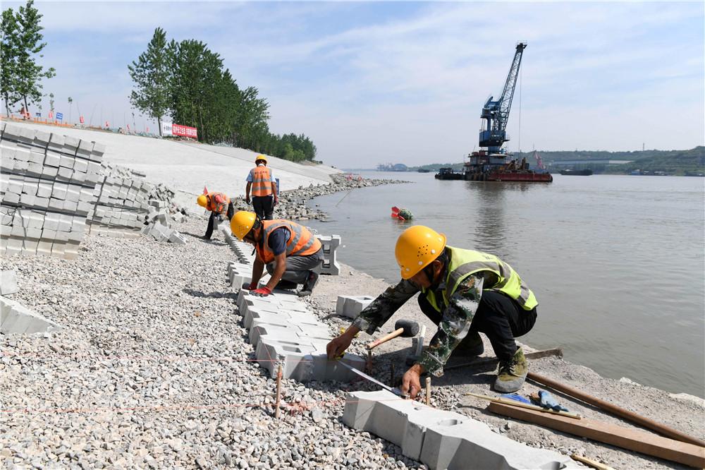 5月13日,施工人员在长江铜陵河段综合治理工程老洲乡堤岸边砌筑护坡,确保已开工长江堤岸在今年长江汛期到来之前完工,发挥效益。 本报通讯员 过仕宁 摄