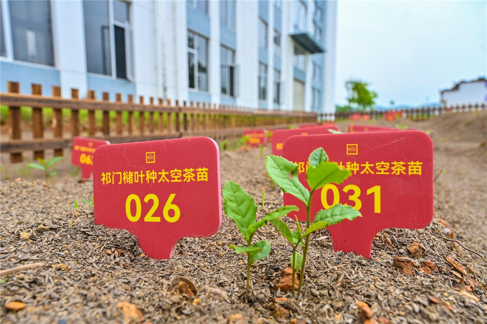 5月18日拍摄的祁门县太空茶苗。去年9月,祁门槠叶种茶籽搭载实践十九号卫星进入太空,历经14天返回地面,于去年11月1日种在祁门县平里产业园种植基地。今年4月20日,太空茶籽萌芽出土,目前苗株壮实。