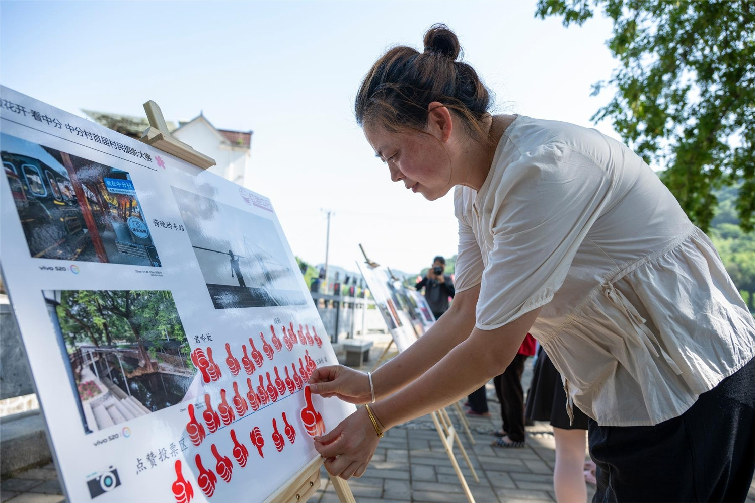 5月19日,芜湖市繁昌区孙村镇中分村,村民在给自己喜欢的摄影作品投票。该村举办“首届村民摄影大赛”活动,村民通过自己的视角去记录和展现家乡人文、生态与文化之美。