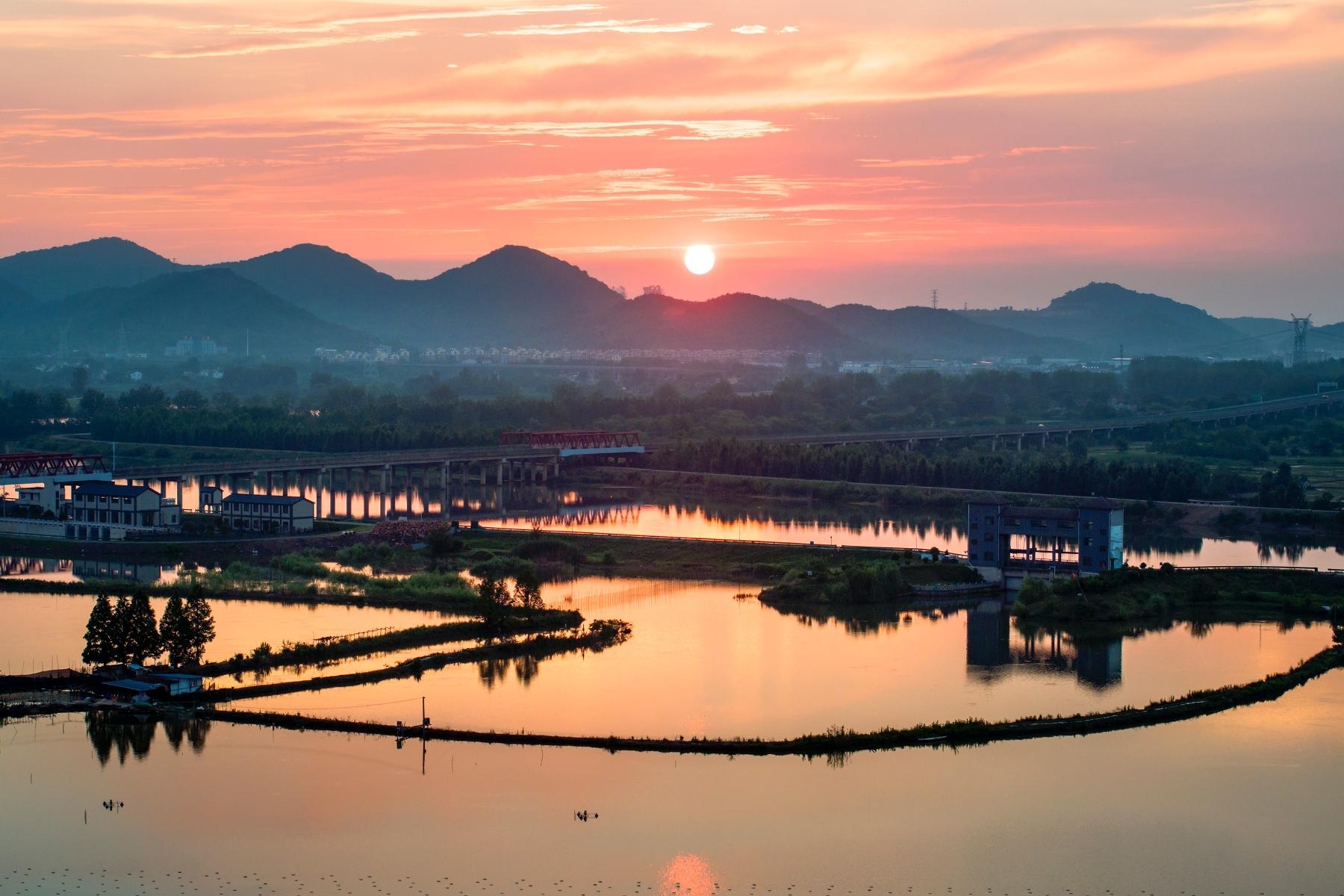 6月13日,芜湖市繁昌区峨山镇城东村,晚霞映照下的马场湖湖面碧波荡漾,与远山、桥梁、村庄等相映成趣。