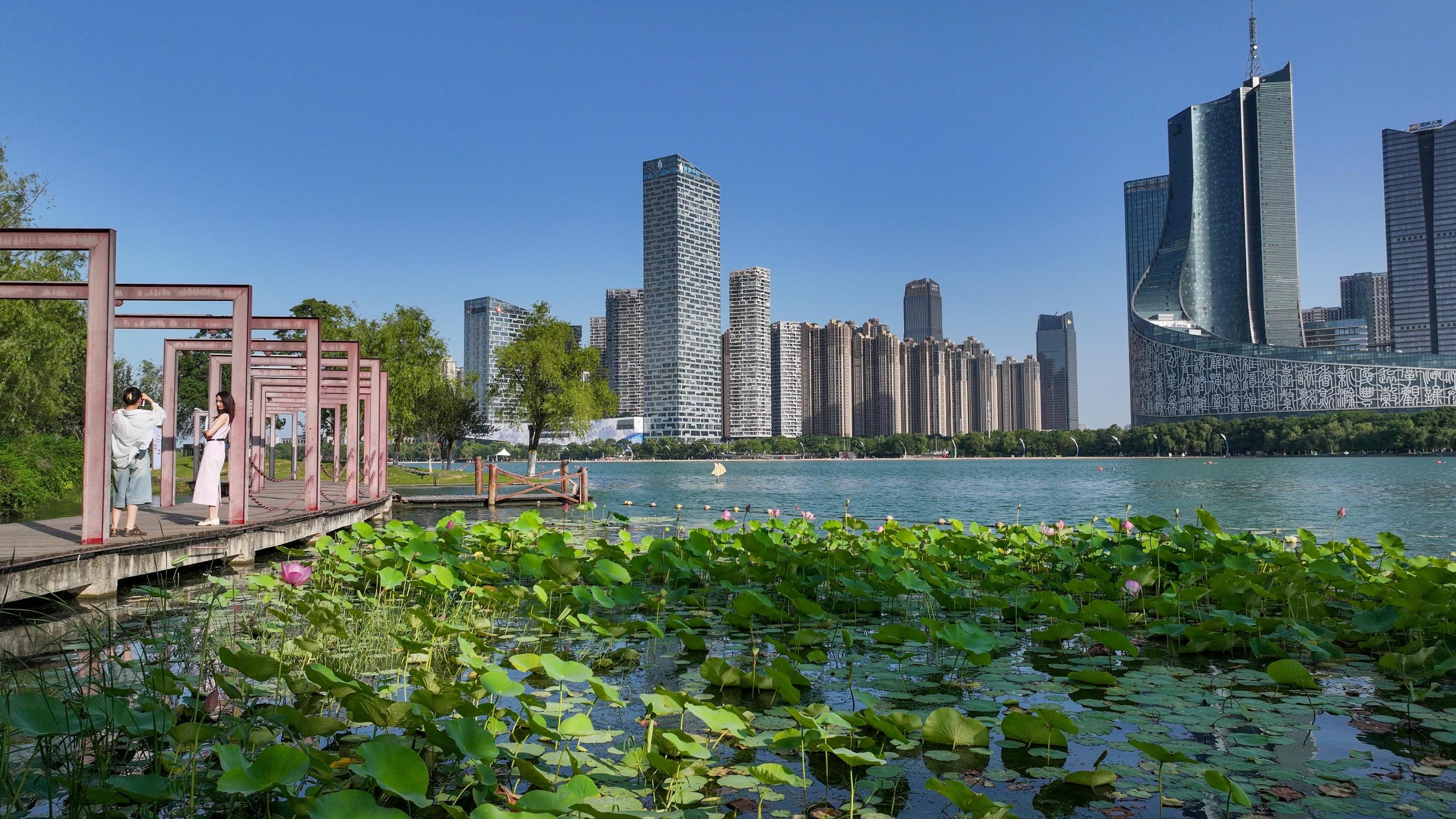 6月17日,市民在合肥市蜀山区天鹅湖公园的亲水平台边拍照打卡。近日,合肥市蜀山区天鹅湖公园内,荷韵初绽,风姿绰约,引得游人纷至沓来。