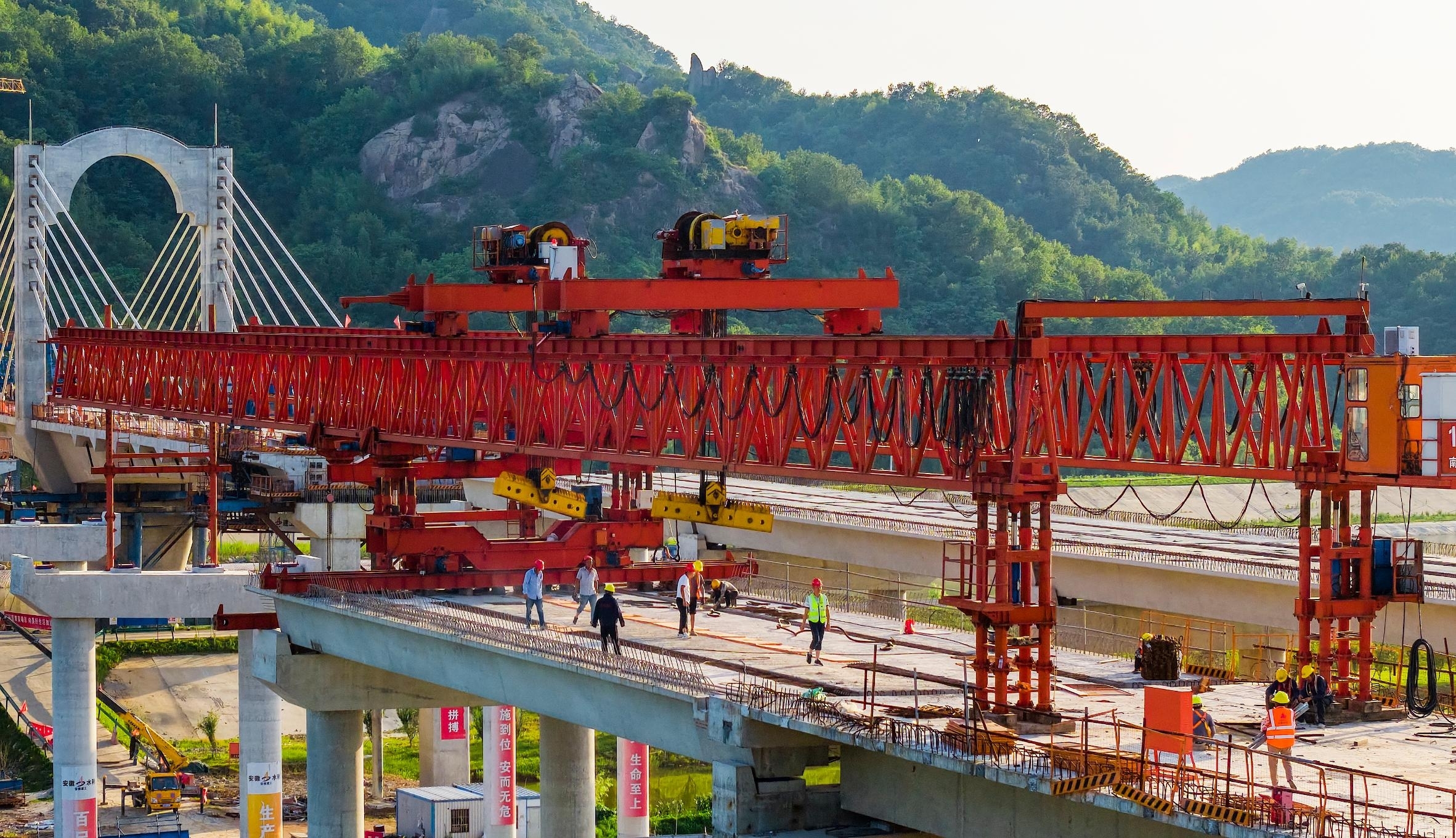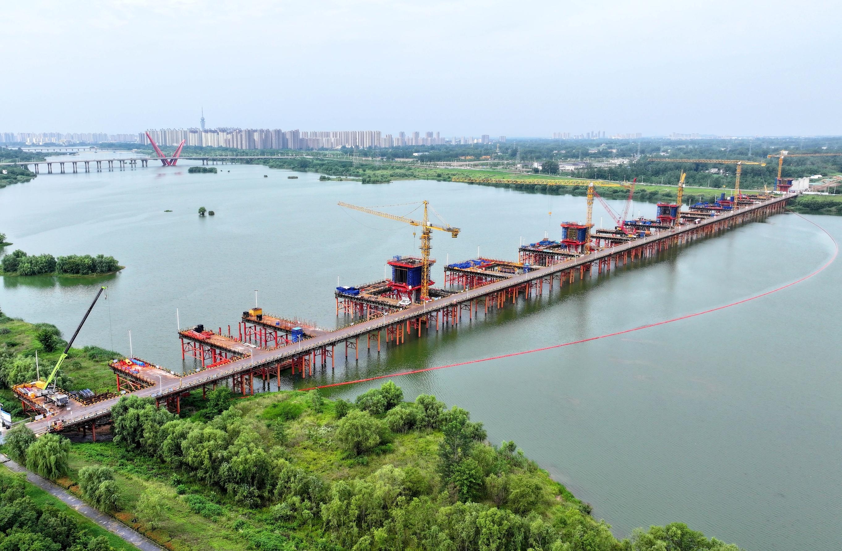 6月15日,合(肥)武(汉)高速铁路六安金裕淠河特大桥施工现场,工人在河面上加紧施工,部分桥墩雏形初现。合武高铁设计时速350公里,预计2028年建成通车。本报通讯员 田凯平 摄