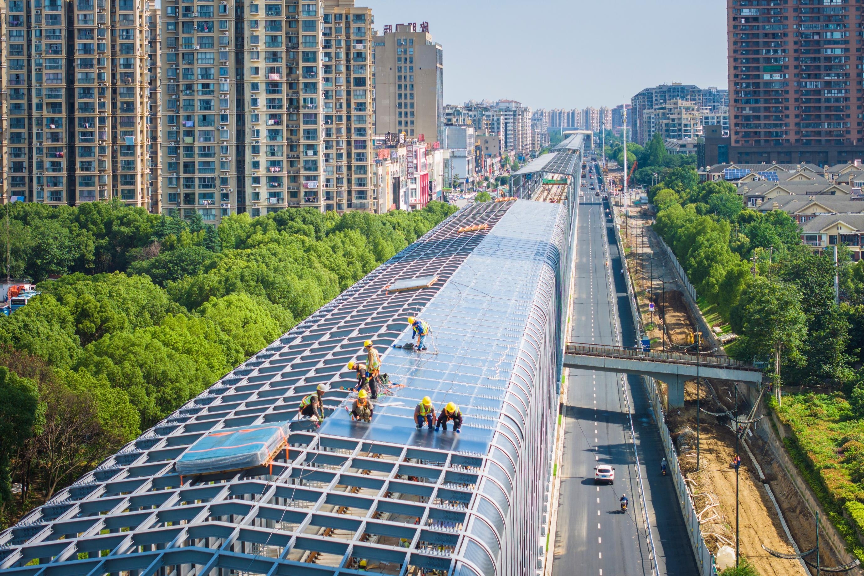 6月18日,马鞍山市花山区宁马城际铁路建设现场,工人正在安装声屏障。宁马城际铁路建成后,江苏省南京市和马鞍山市两市中心城区将30分钟直接通达。本报通讯员 张明伟 摄