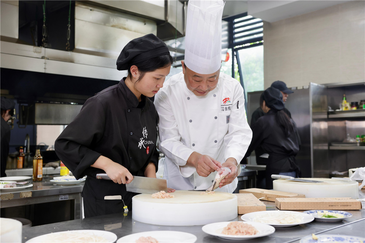 6月19日,张根东在黄山职业技术学院文化与旅游学院的操作间里指导学生制作徽菜。