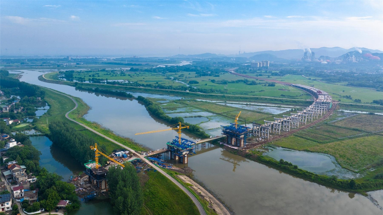 6月25日拍摄的位于芜湖市繁昌区荻港镇的G236黄浒河特大桥工程工地。黄浒河特大桥是繁昌区G236阮弄口至铜陵界一级公路改造项目的重要节点工程,按双向四车道一级公路标准建设。工程建成后将加强芜湖与周边城市的交通联系,解决货运车辆过境通行问题,提升物流效率。