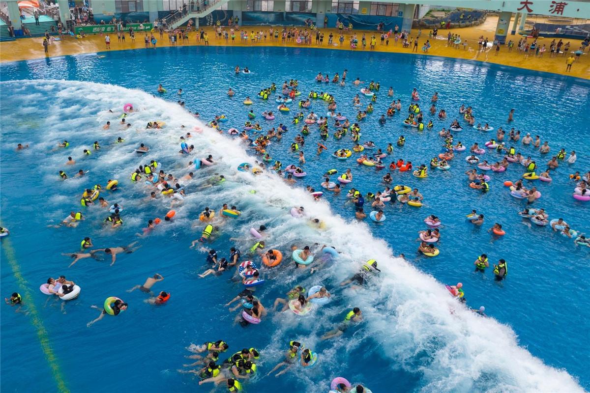 7月12日,游客在南陵县许镇镇大浦乡村世界海啸馆体验趣味水上活动,享受清凉。
