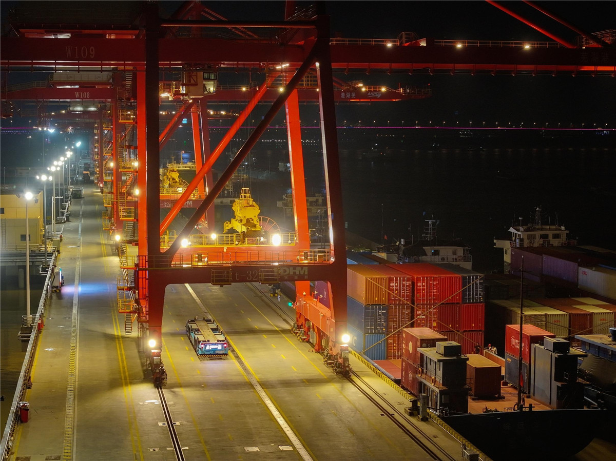 6月25日晚,无人智能运输车在芜湖港朱家桥智慧港口机站自动装卸集装箱。