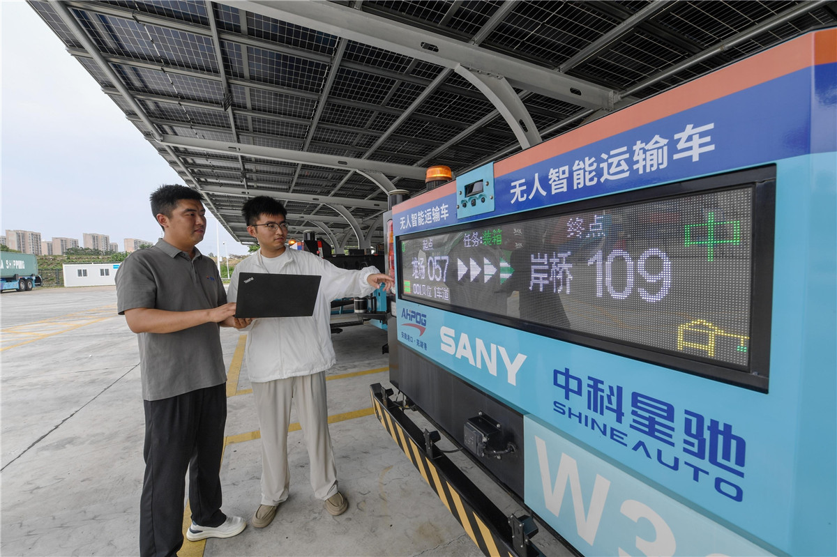 6月25日,在芜湖港朱家桥智慧港口,科研人员做无人智能运输车调试升级工作。
