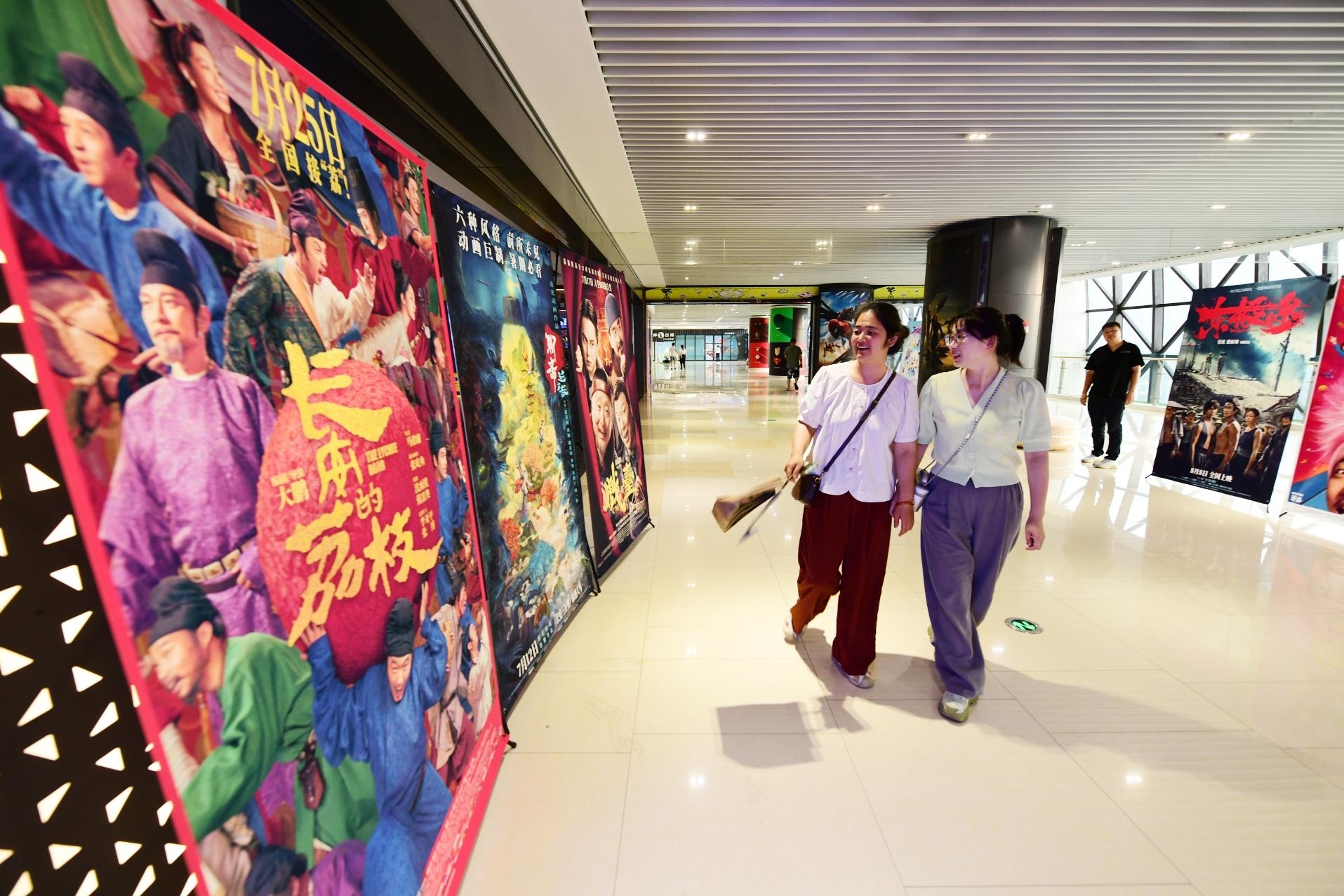 7月25日, 阜阳市的学生在该市淮河路一家影城大厅内观看电影海报。暑假期间,阜阳市电影市场十分红火。据网络平台数据,截至7月27日11时19分,2025年全国暑期档(6月至8月)总票房(含预售)已突破50亿元,单日票房连续十天破亿,档期总人次1.29亿。