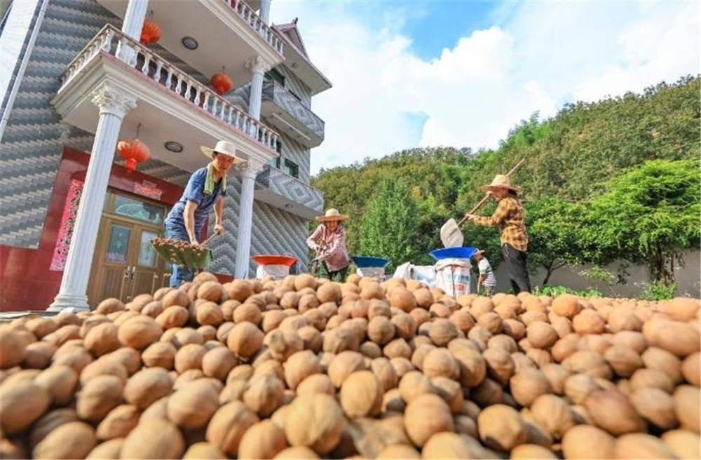 9月4日,歙县金川乡伏黄村,村民在晾晒新收获的山核桃。目前,歙县十万亩山核桃林迎来了丰收季。本报通讯员 郑宏 摄