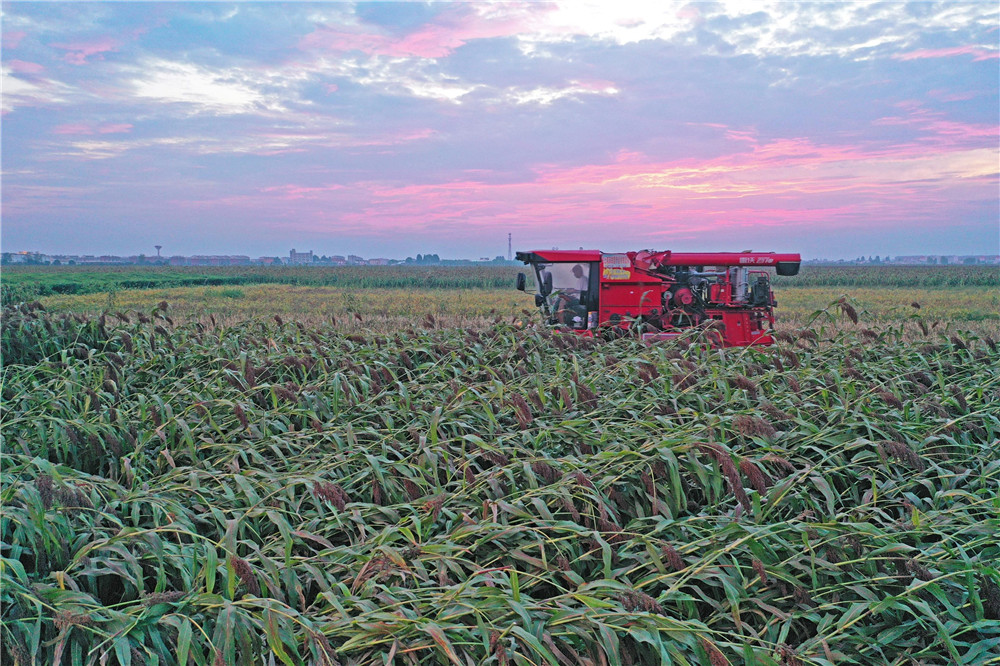 9月5日,宿松县复兴镇的农田里,安徽农垦华阳河农场组织机械抢收高粱。目前,4万多亩高粱陆续成熟,农场组织机械适时抢收,确保粮食颗粒归仓。本报通讯员 李龙 摄