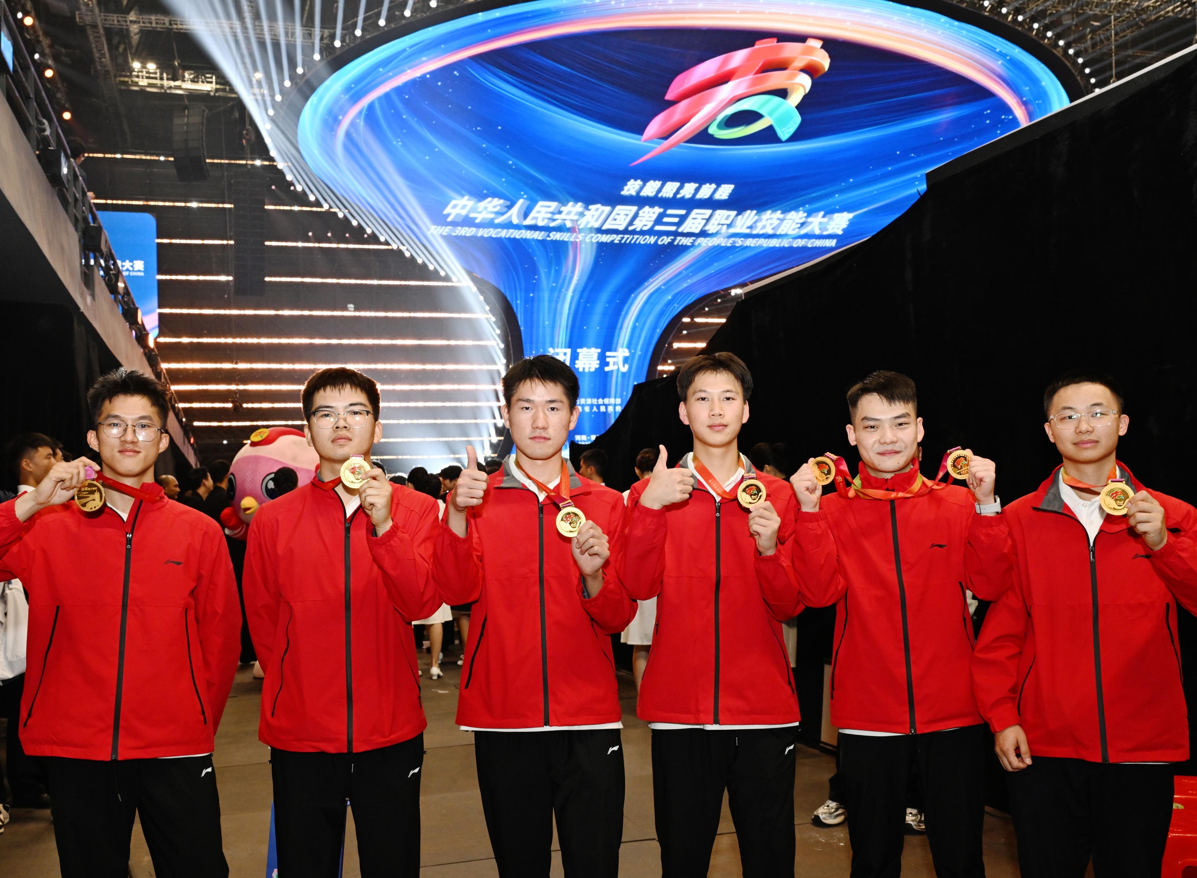 9月23日,在第三届全国技能大赛闭幕式现场,获得金牌的安徽代表团成员手持奖牌合影。