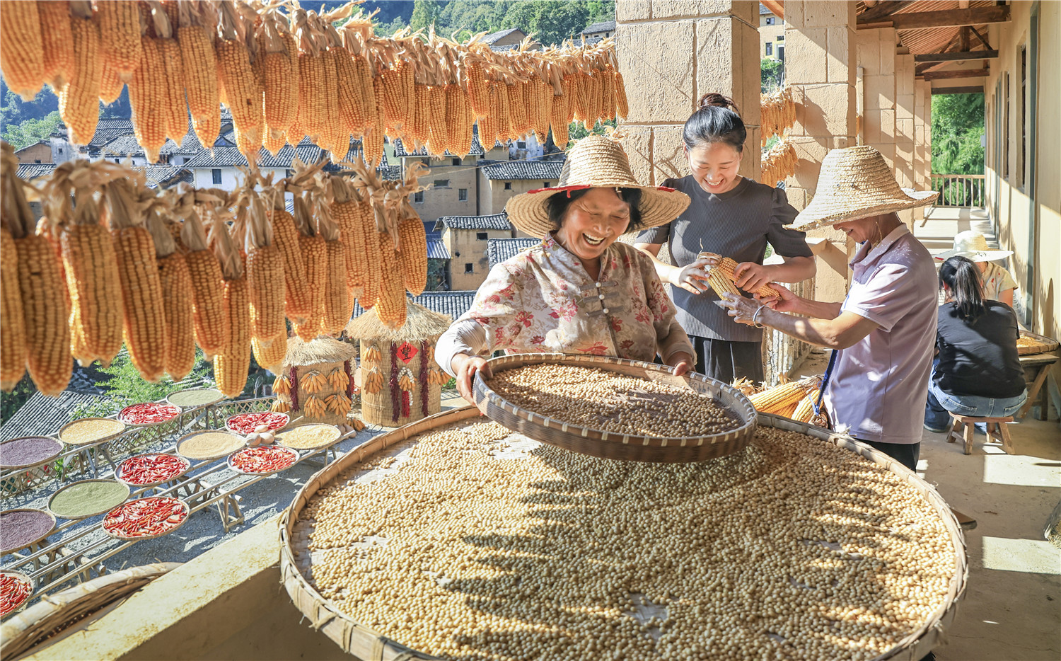 9月17日,歙县深渡镇阳产村,村民忙着晾晒秋收农作物。本报通讯员 郑宏 摄