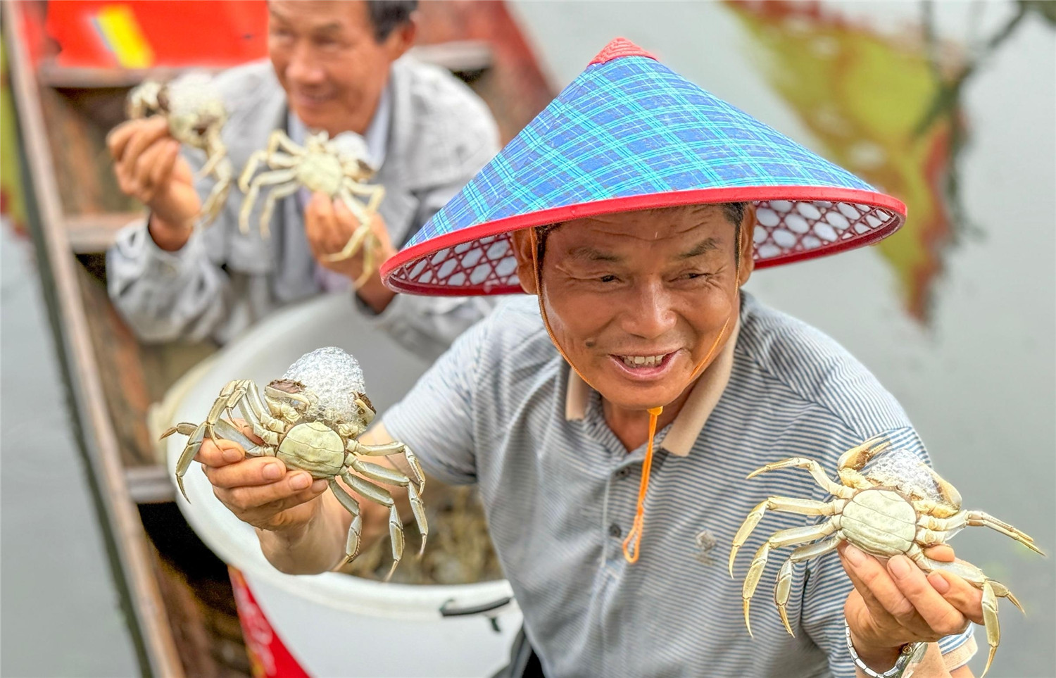 9月25日,当涂县螃蟹开捕节在该县塘南镇白马村河蟹养殖基地举行,养殖户在展示刚捕捞的螃蟹。本报记者 李博 摄