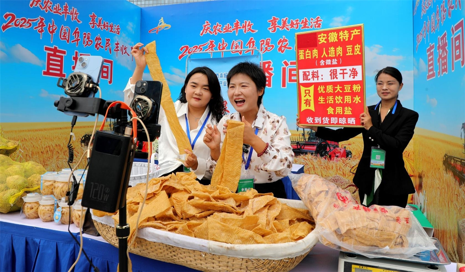 9月20日,在临泉县农民丰收节活动现场,农民主播直播推介销售农副产品。本报通讯员 宿飞 摄