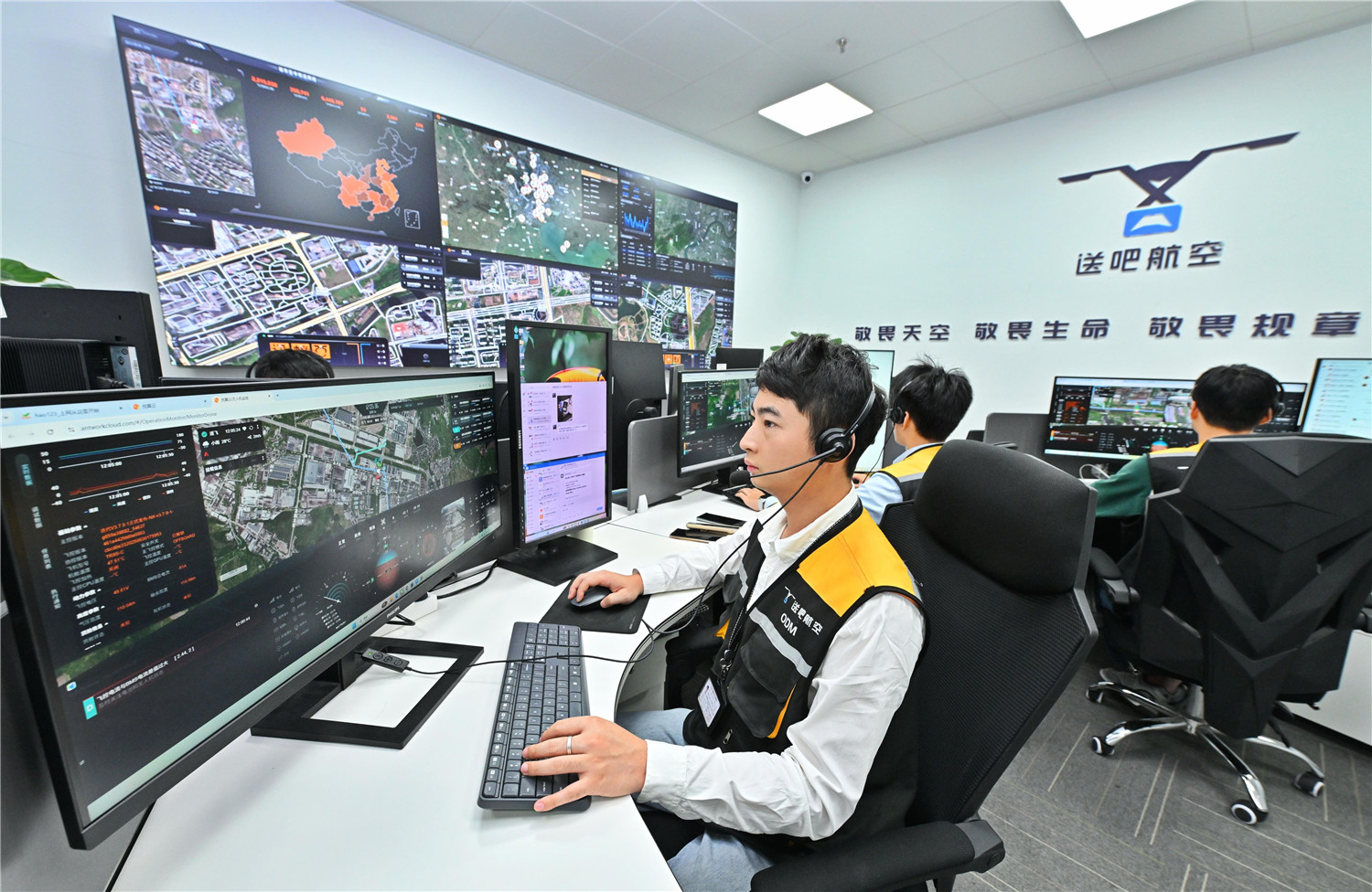 9月24日,合肥送吧飞合低空物流有限公司,工作人员在远程监控无人机飞行。
