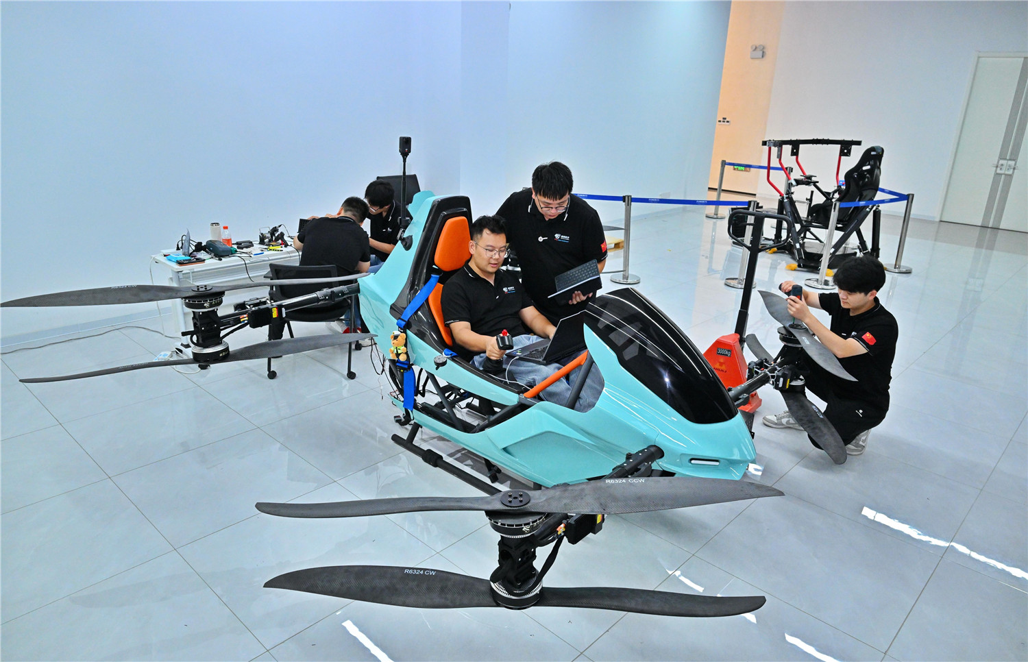 9月23日,安徽猛狮航空科技有限公司,技术人员在调试“智能飞行摩托”。猛狮航空是清华大学智能飞行汽车重大科技成果转化项目。