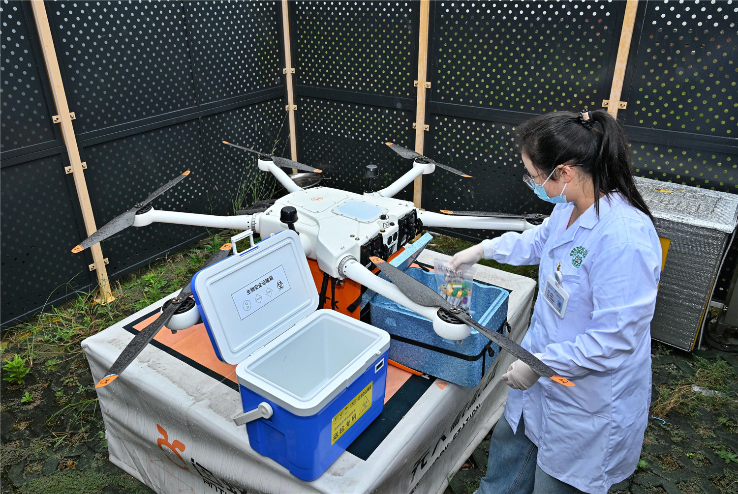 9月24日,合肥市包河区方兴社区卫生服务中心,工作人员使用无人机运输待检样本。