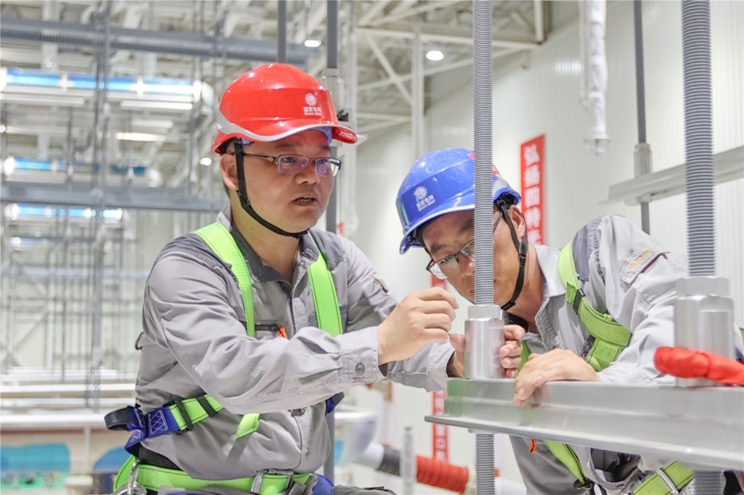 10月8日,在合肥市庐江县±800千伏合州换流站建设现场,大国工匠王开库(左一)正在安装电气设备。该项目投运后,每年可向安徽各地输送电量超过360亿千瓦时。本报记者 李博 本报通讯员 郑贤列 摄