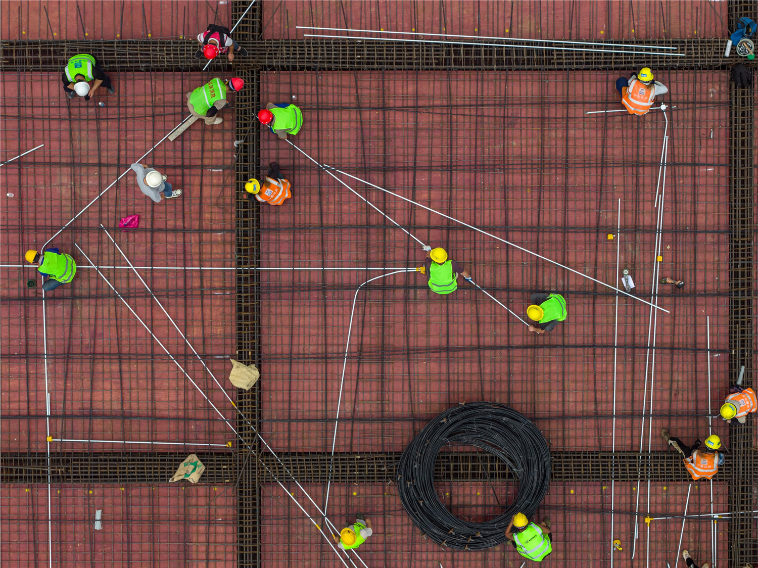 10月2日,建设者在中建二局合肥市高新区体育中心项目工地进行施工作业(无人机照片)。国庆中秋假期,许多劳动者坚守施工一线,全力推进项目建设。本报记者 范柏文 摄