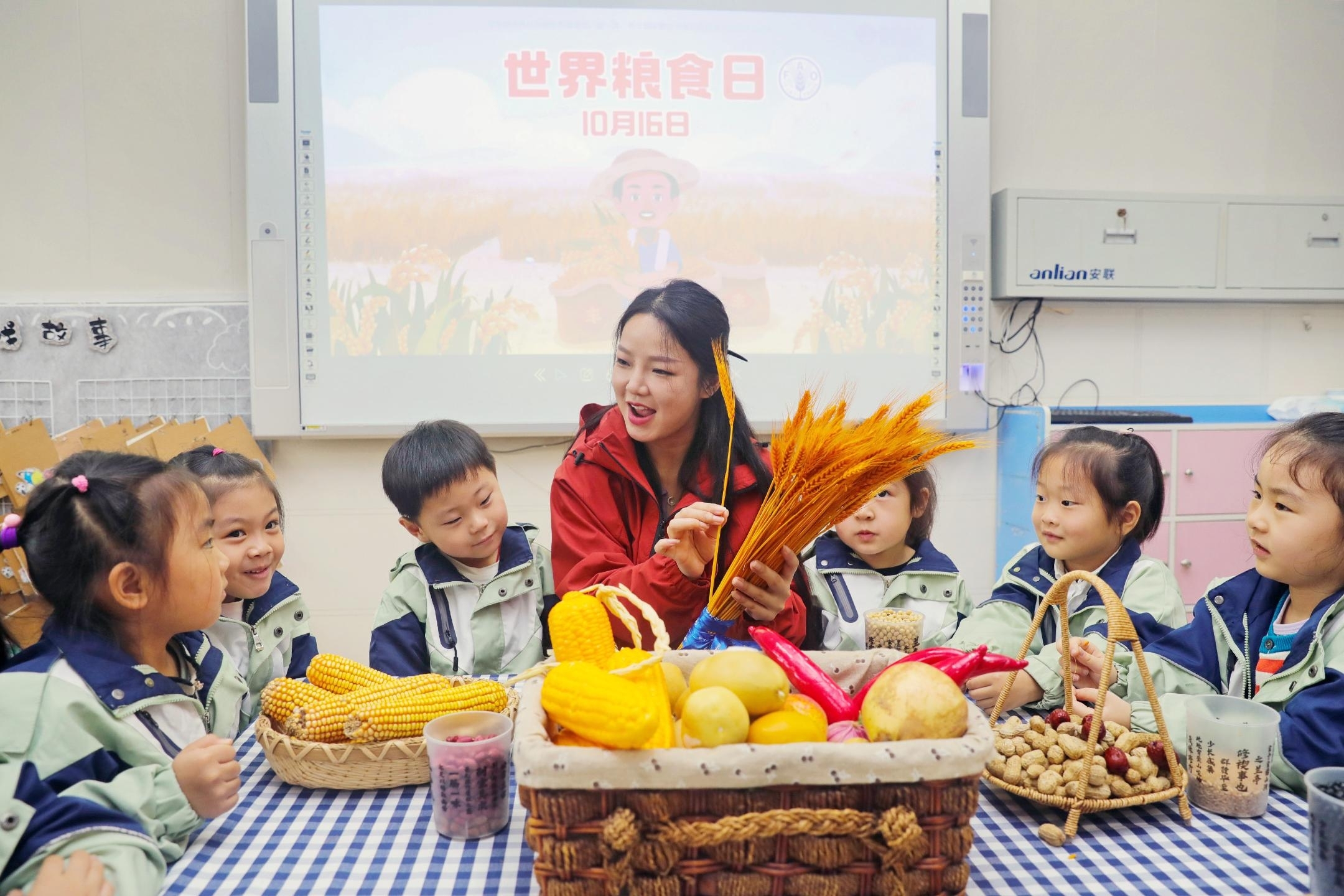 10月15日,淮北市第二实验幼儿园,老师教小朋友认识玉米、稻谷等五谷杂粮。在10月16日世界粮食日到来之际,该幼儿园开展主题教育活动,培养孩子们爱惜和节约粮食的意识。本报通讯员 万善朝 摄