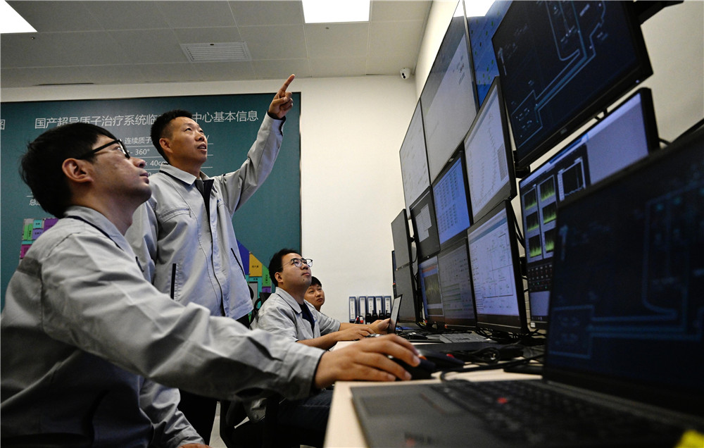 10月12日,合肥中科离子医学技术装备有限公司总经理陈永华(左二)与科研人员查看国产首台超导回旋质子治疗系统。