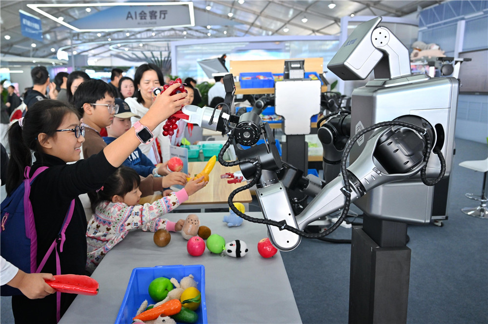 在科博展上,小朋友正在与阿尔法蛋围棋机器人对弈。