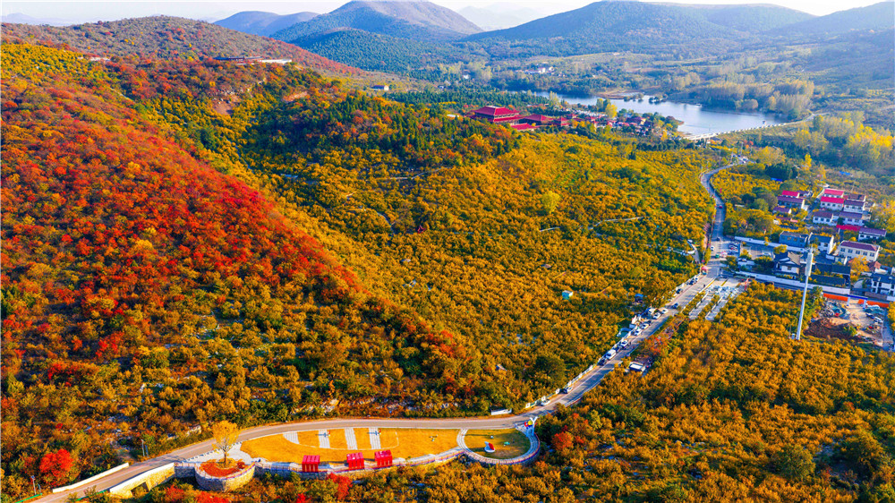 11月2日航拍的淮北市烈山区烈山镇榴园村景色。深秋时节,当地层林尽染,金黄的石榴园与远处的村庄、公路、湖水相映成趣,构成一幅美丽乡村画卷,吸引众多游客前来赏景游玩。